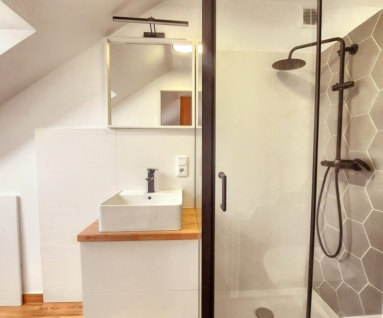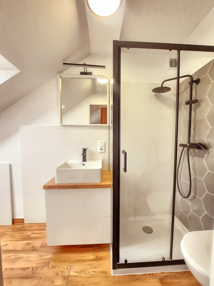 • druga kondygnacja: łazienka wykończona w wysokim standardzie: kabina prysznicowa, umywalka, lustra, toaleta – pokoje: szafy, łóżka.