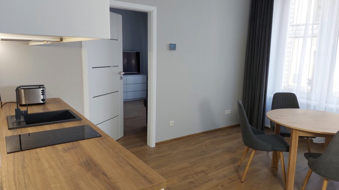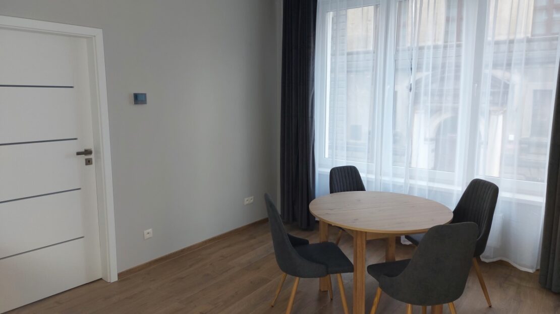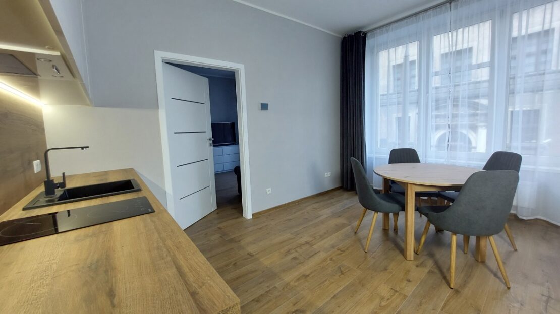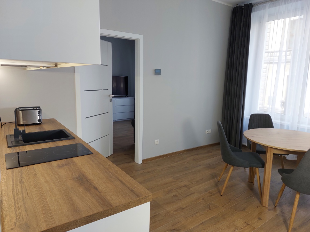 Dwa przestronne i jasne, dzięki ogromnym oknom, pokoje. Kuchnia otwarta. Pomiędzy nimi bardzo szerokie drzwi 90cm, po otwarciu dają wrażenie dużej przestrzeni. Nowoczesna, przestronna i ciepła łazienka. W mieszkaniu absolutnie wszystko jest całkowicie nowe i w bardzo przyzwoitym standardzie: