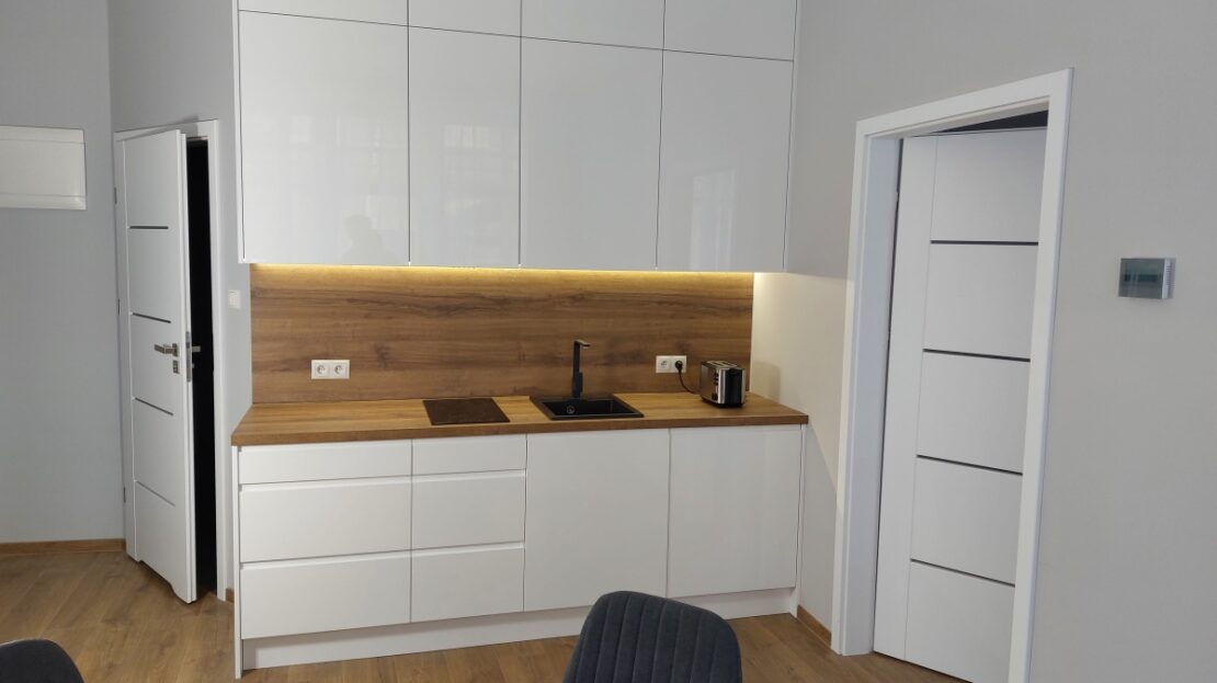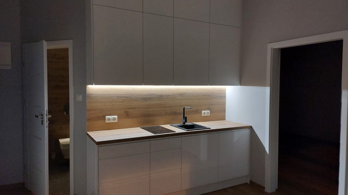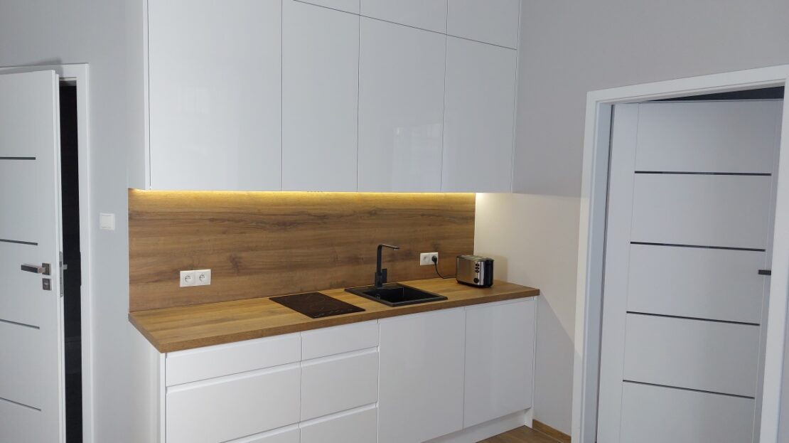 – kuchnia na wymiar z okuciami Blum, granitowym zlewozmywakiem, podszafkowym wyciągiem, nowoczesną płytą indukcyjną i ściemnianym podświetleniem LED na całej długości blatu roboczego