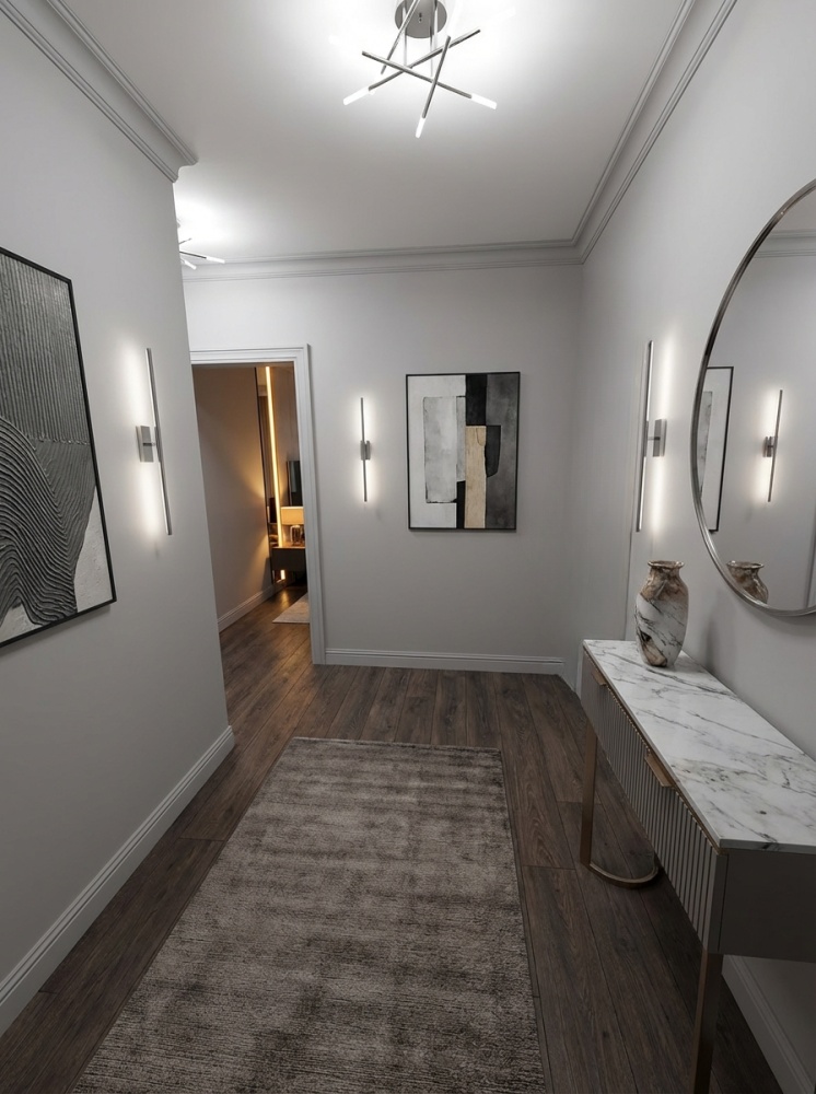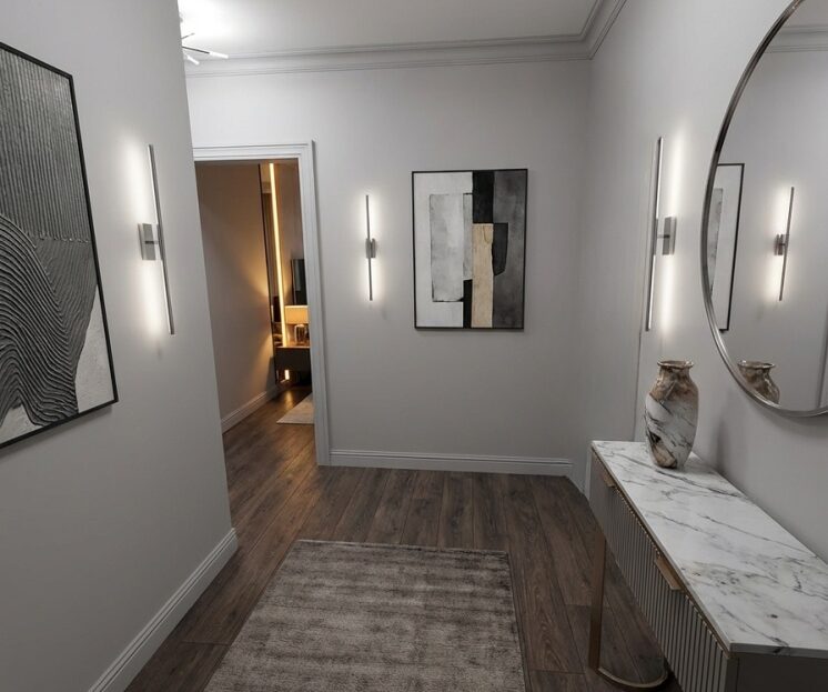 Prezentowane wizualizacje mają charakter poglądowy i zostały wygenerowane przy użyciu narzędzi sztucznej inteligencji. Przedstawiają przykładową aranżację wnętrza i nie stanowią odzwierciedlenia stanu faktycznego nieruchomości ani oferty wykończenia.