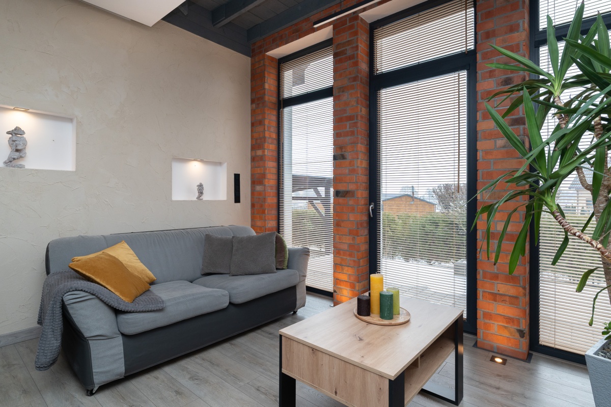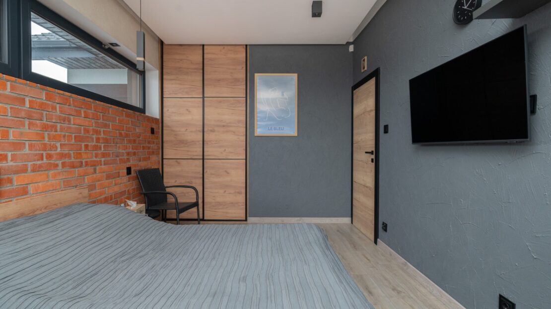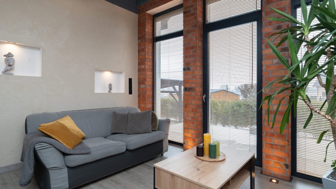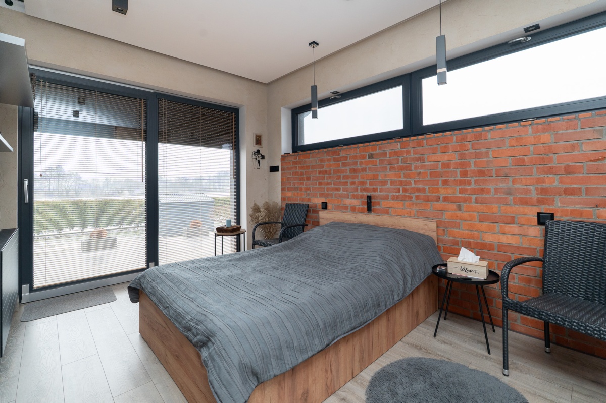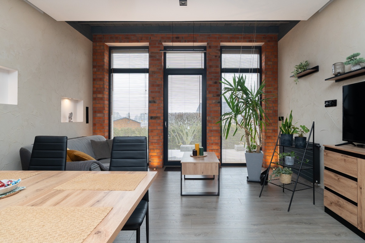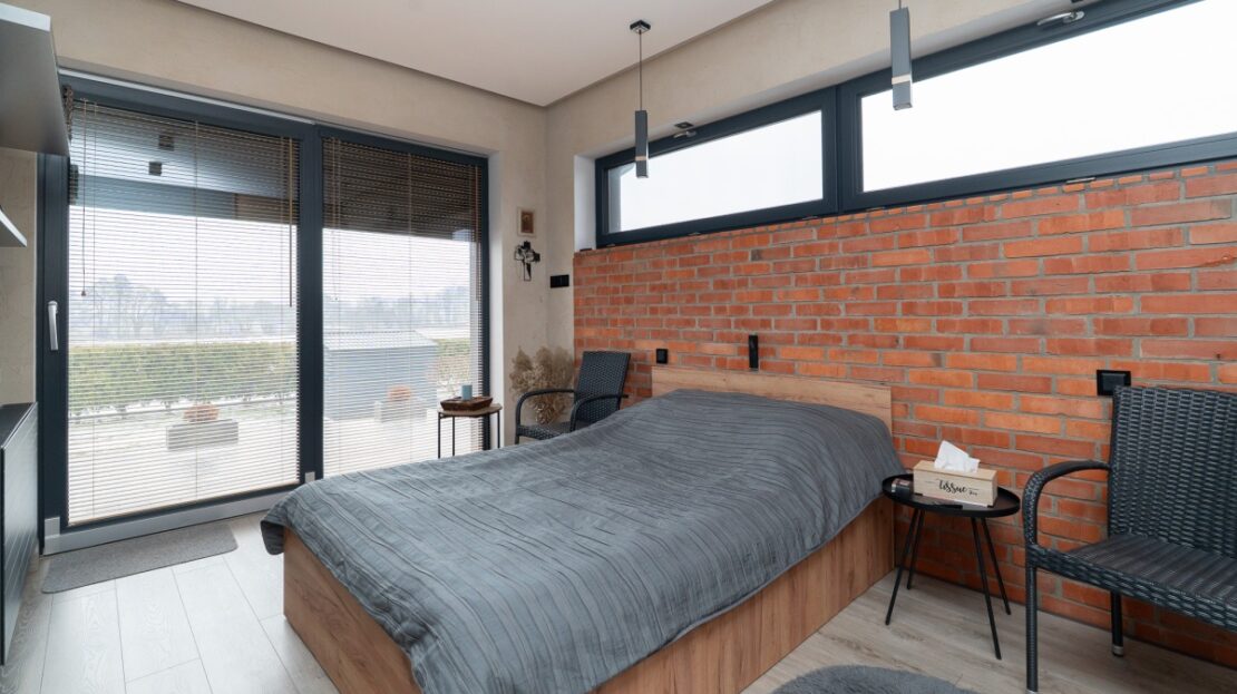 W domu zastosowano bambusowe rolety wewnętrzne, które pięknie współgrają z ceglanymi wstawkami na ścianach, nadając wnętrzu ciepły, przytulny i lekko loftowy klimat. Naturalne materiały tworzą spójną, estetyczną całość i podkreślają nowoczesny charakter nieruchomości.