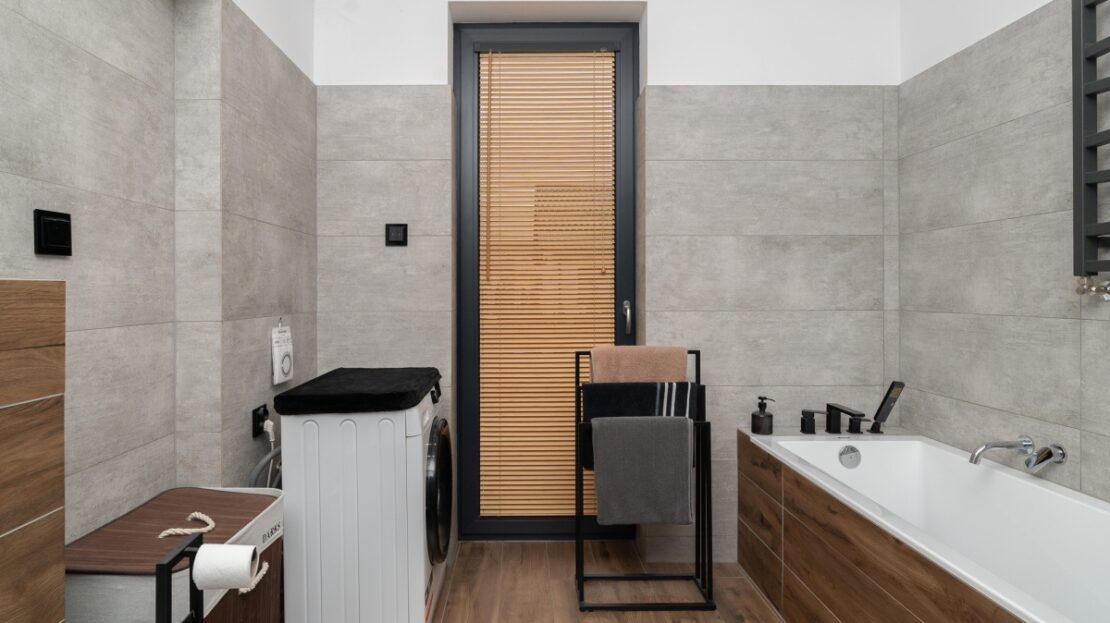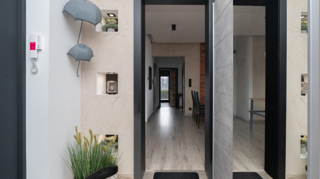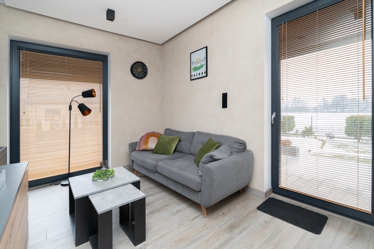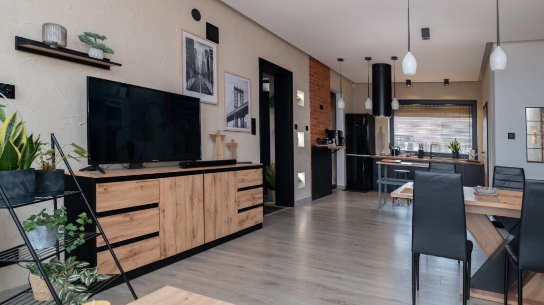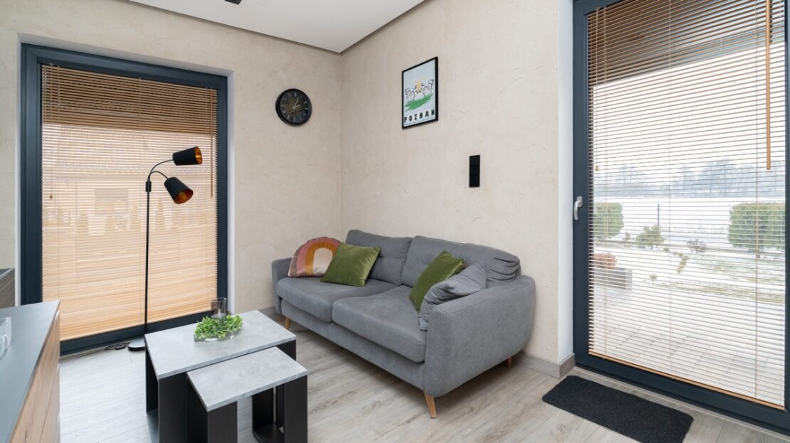 W domu zastosowano bambusowe rolety wewnętrzne, które pięknie współgrają z ceglanymi wstawkami na ścianach, nadając wnętrzu ciepły, przytulny i lekko loftowy klimat. Naturalne materiały tworzą spójną, estetyczną całość i podkreślają nowoczesny charakter nieruchomości.