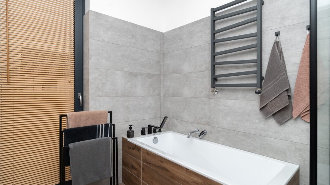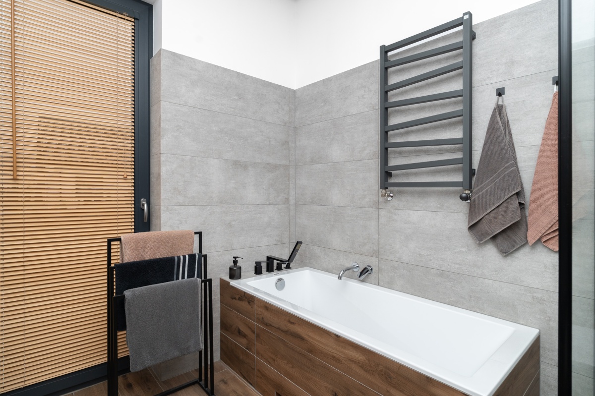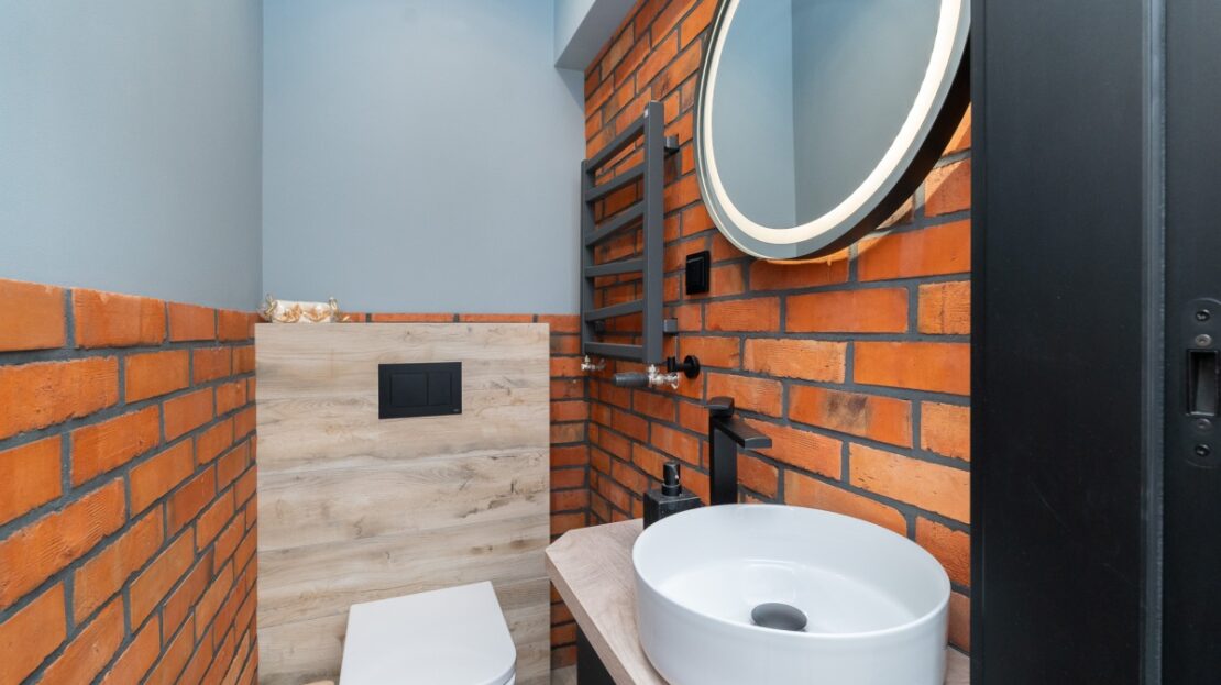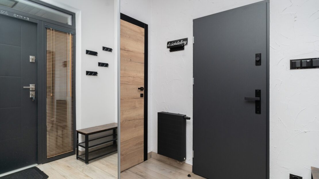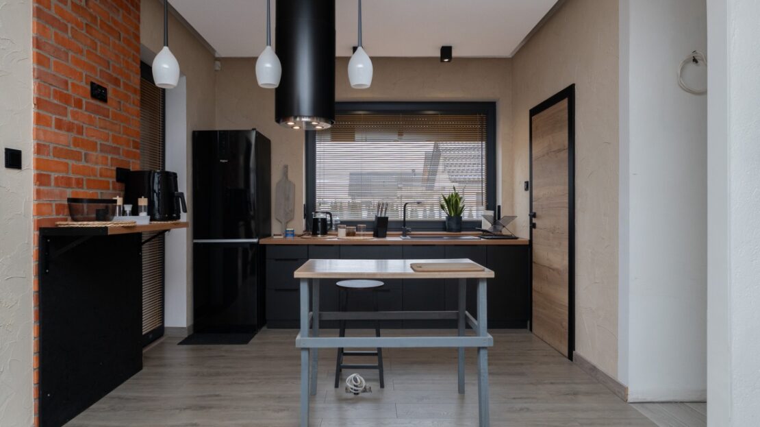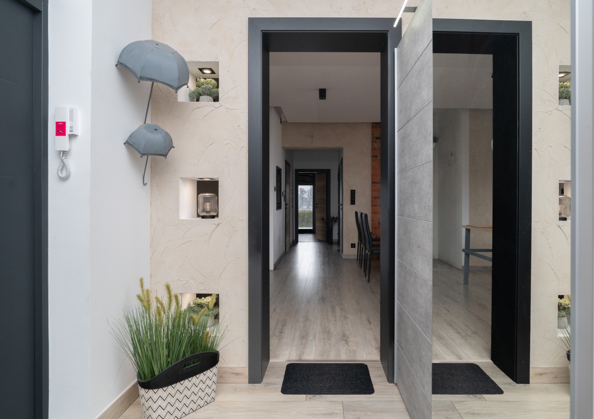 W domu zastosowano bambusowe rolety wewnętrzne, które pięknie współgrają z ceglanymi wstawkami na ścianach, nadając wnętrzu ciepły, przytulny i lekko loftowy klimat. Naturalne materiały tworzą spójną, estetyczną całość i podkreślają nowoczesny charakter nieruchomości.