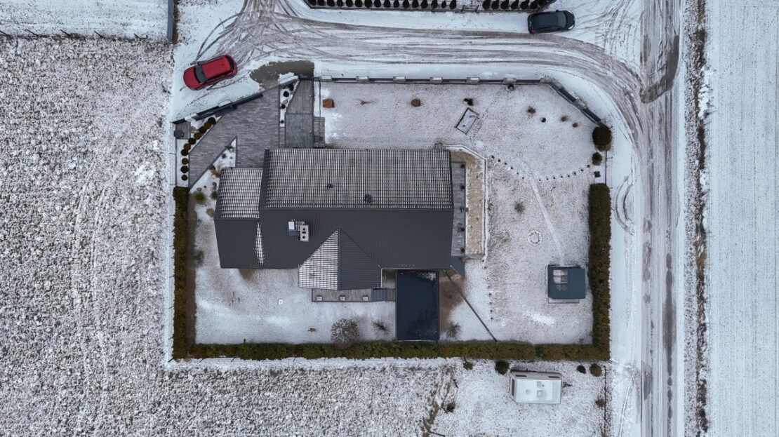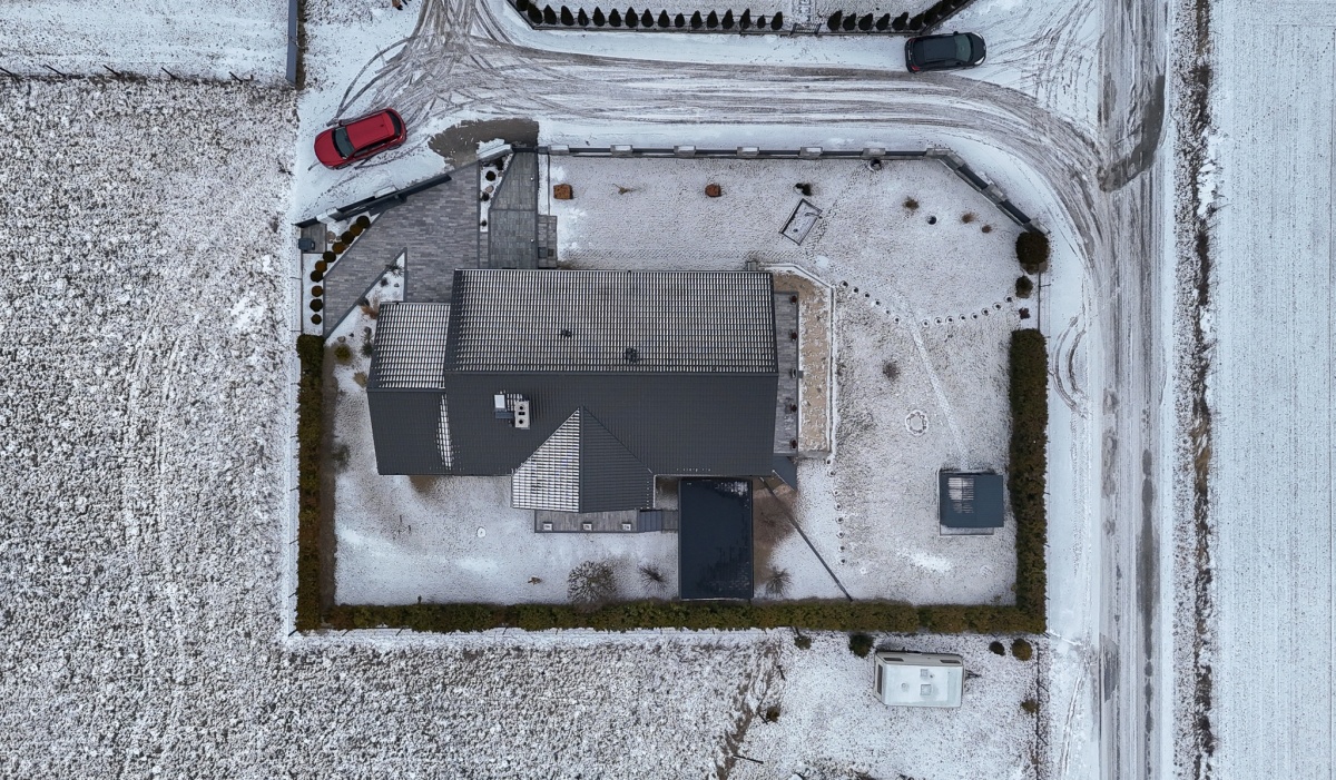 Ponadto w bryle budynku znajduje się spory garaż z bezpośrednim wejściem do domu.