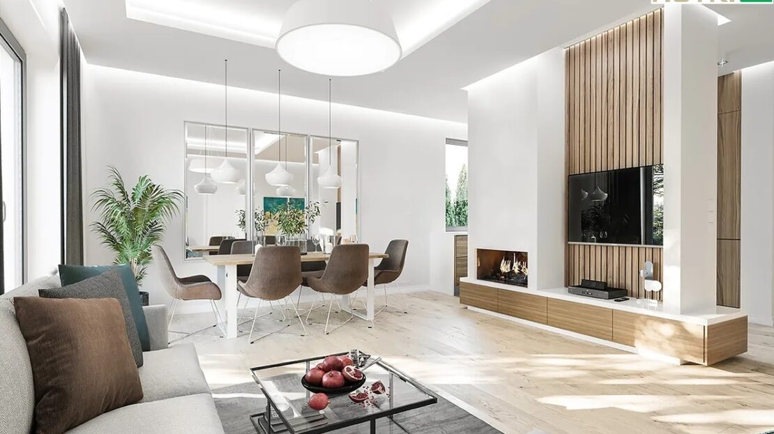 Cena budynku obejmuje wykonane ściany działowe, tynki gipsowe oraz instalacje tylko na parterze, otwory przygotowane do montażu ościeżnic i drzwi wewnętrznych.