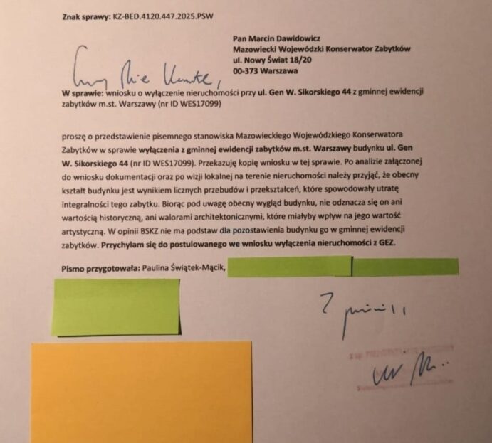 Na działce wybudowany jest budynek mieszkalny wolnostojący. W związku z tym, że nieruchomość jest wpisana do GEZ złożony został wniosek o jego wyłączenie. Aktualnie jest wystawiona opinia Prezydenta Miasta Stołecznego Warszawy z którego wynika, że nie ma podstaw do pozostawienia go w gminnej ewidencji zabytków.