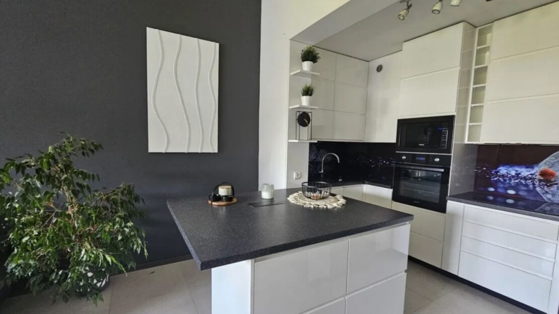 Posiada pełną zabudowę AGD – lodówka, pralka, zmywarka, okap, płyta indukcyjna.