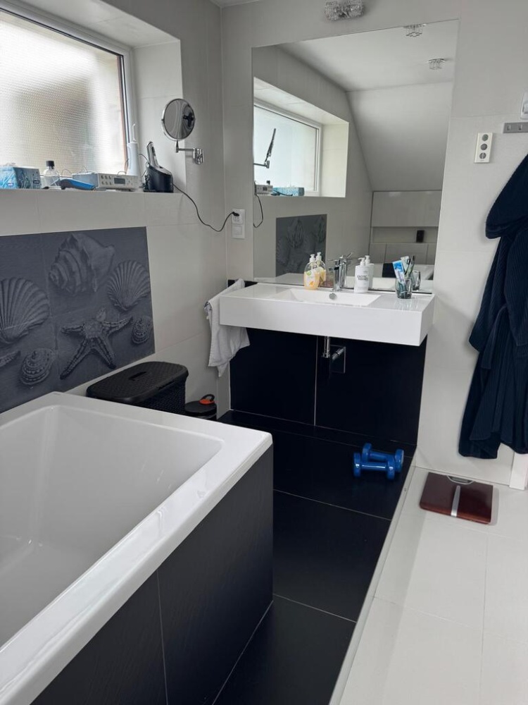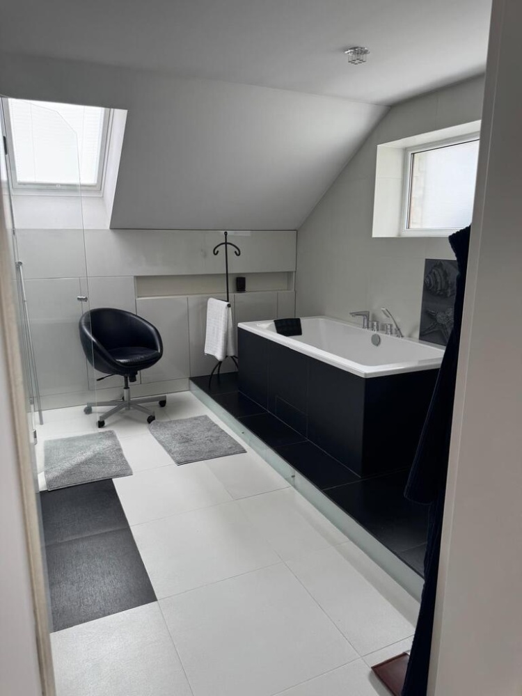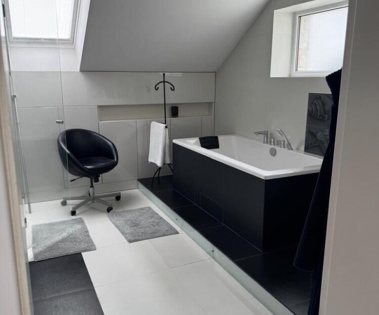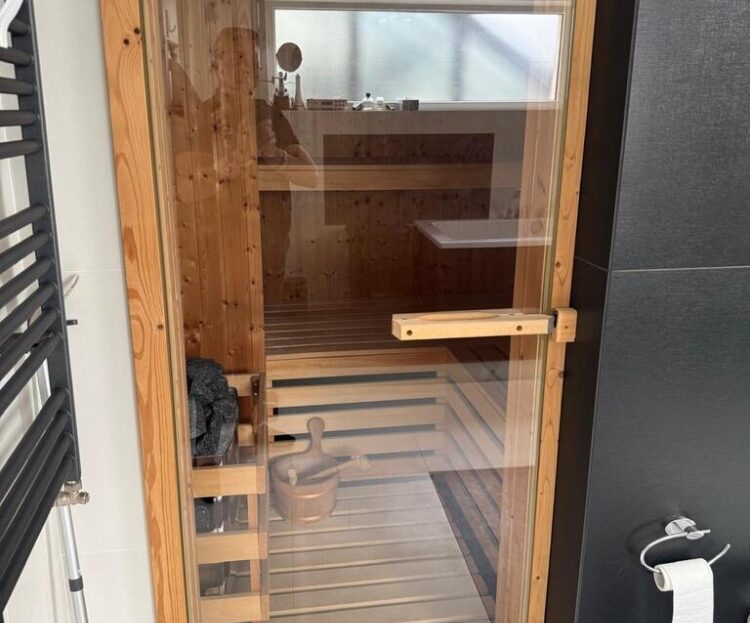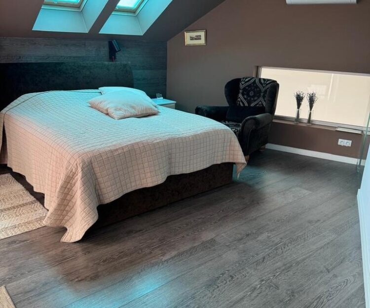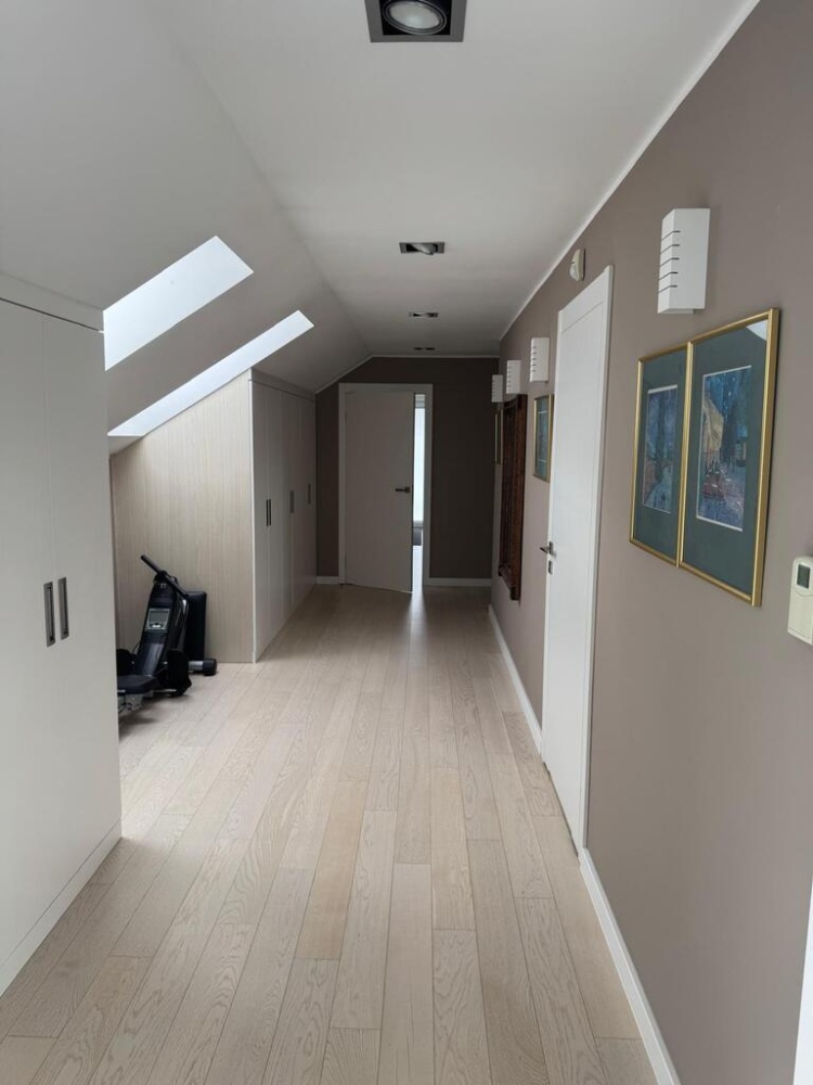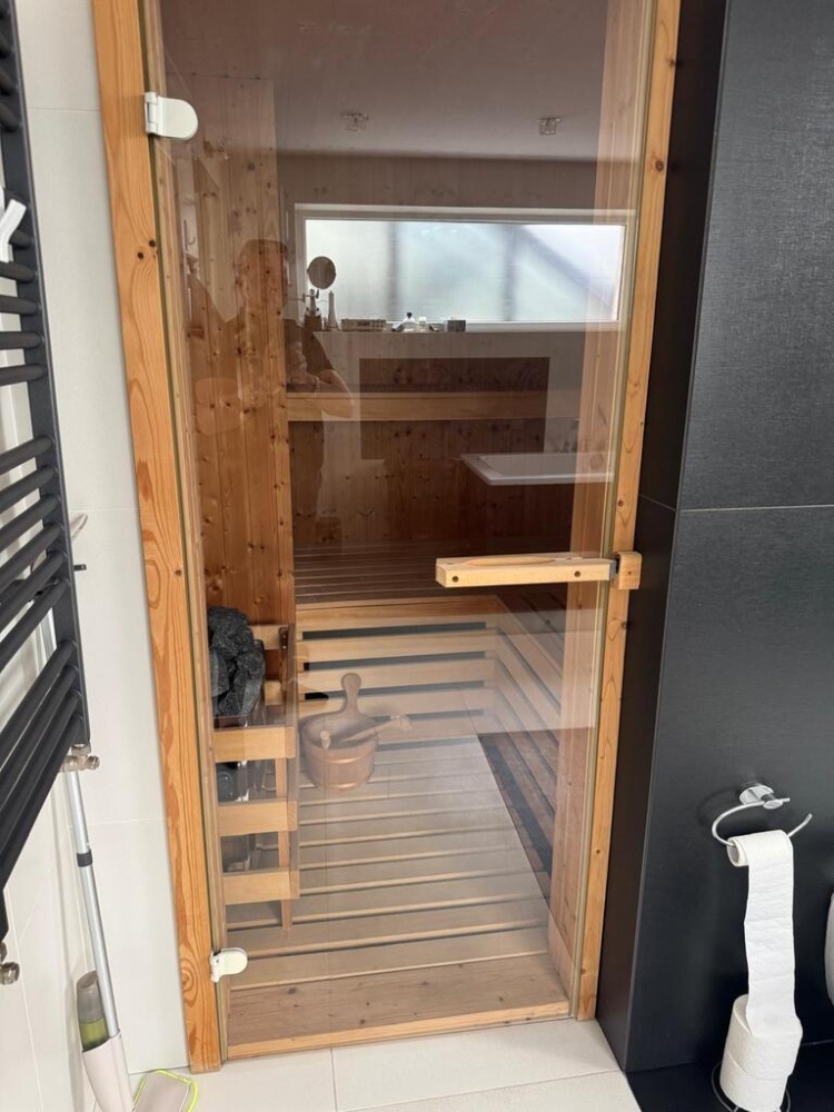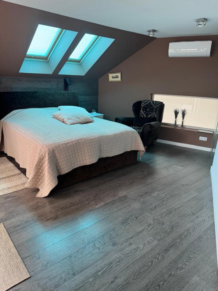 Piętro – dwie sypialnie, gabinet, dwie łazienki, – jedna z nich z sauną oraz pralnia
