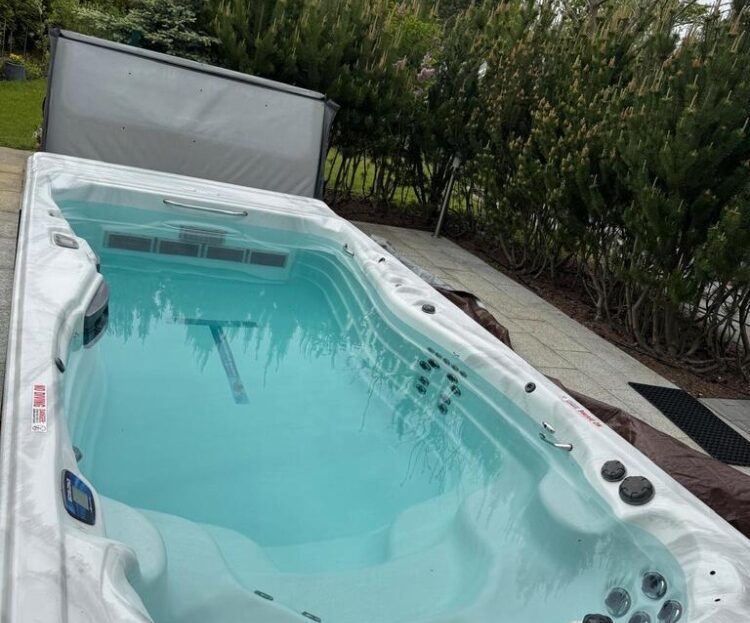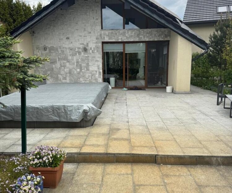 Zaraz po wyjściu z salonu na tarasie znajduje się basen kryty, całoroczny, z masażem, podświetlany.