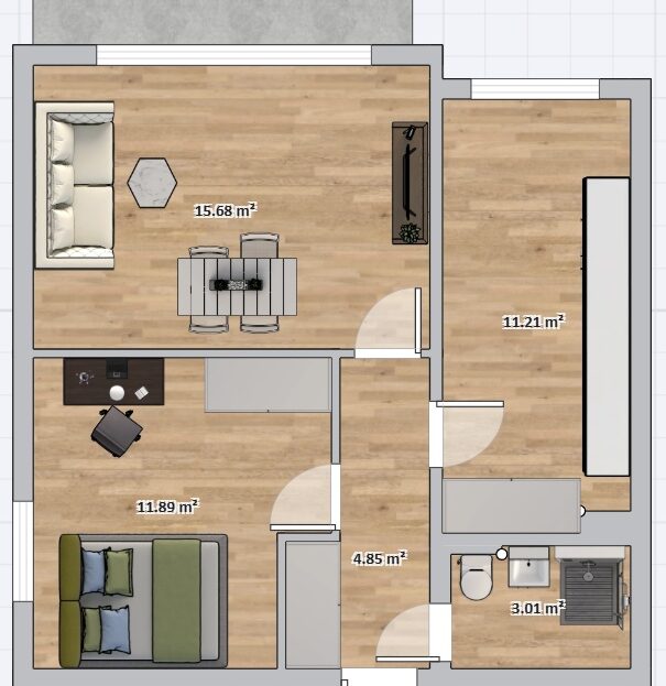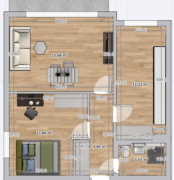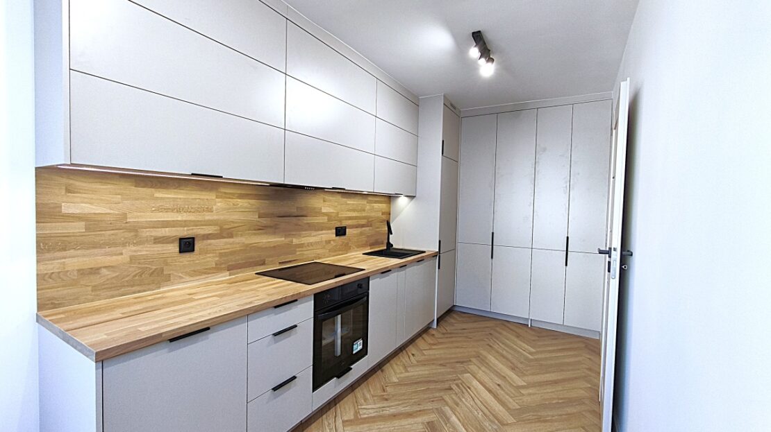 nowe meble na wymiar (zabudowa kuchenna, szafa wnękowa w korytarzu, szafa w sypialni, szafka rtv w salonie)
