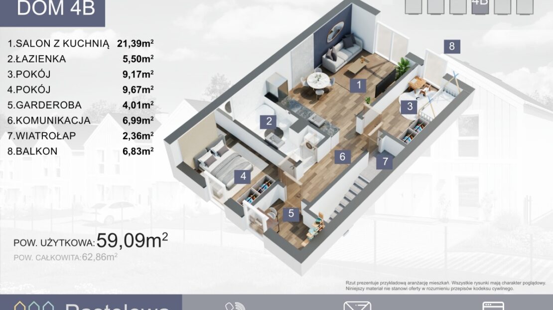 Pastelowa Osada to kameralne osiedle 6 domów dwurodzinnych podzielonych na mieszkania na górze (z balkonem) oraz na dole (z ogrodem).
