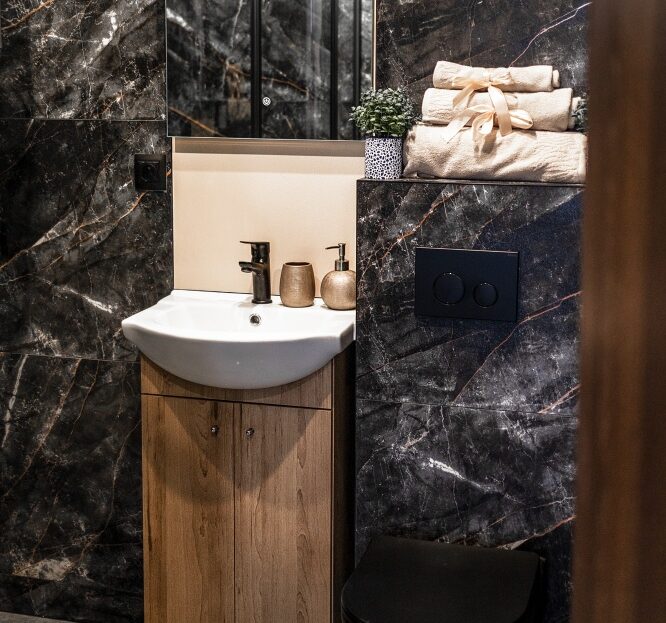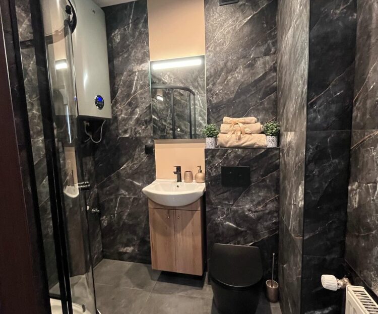 Nowoczesne wnętrze – elegancka łazienka w ciemnych kaflach