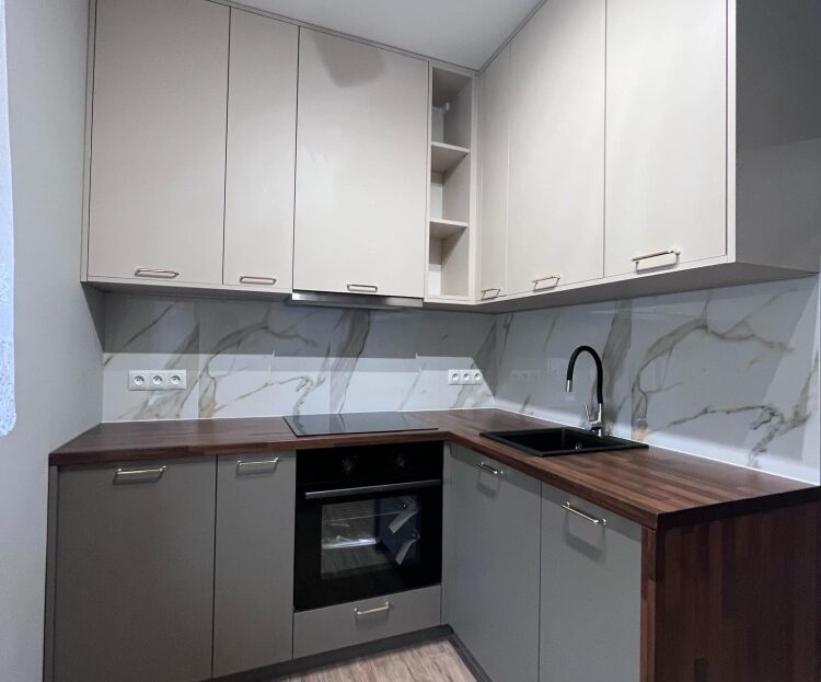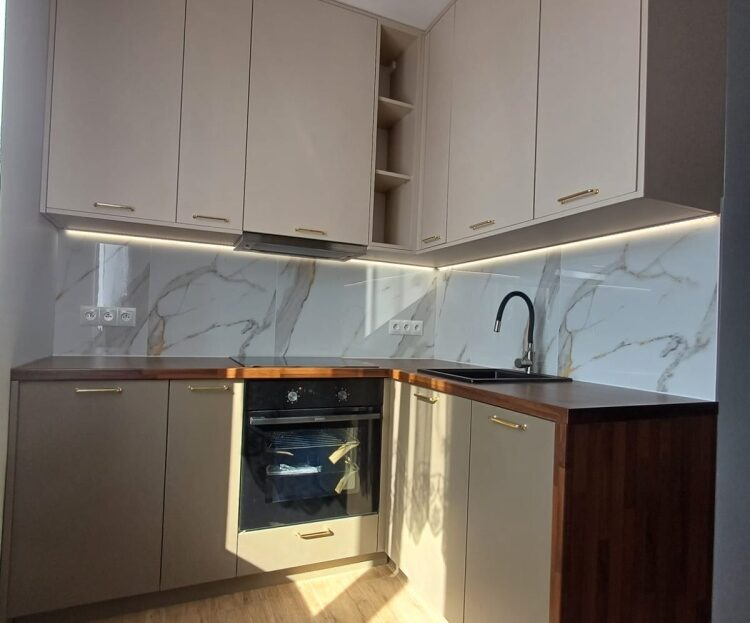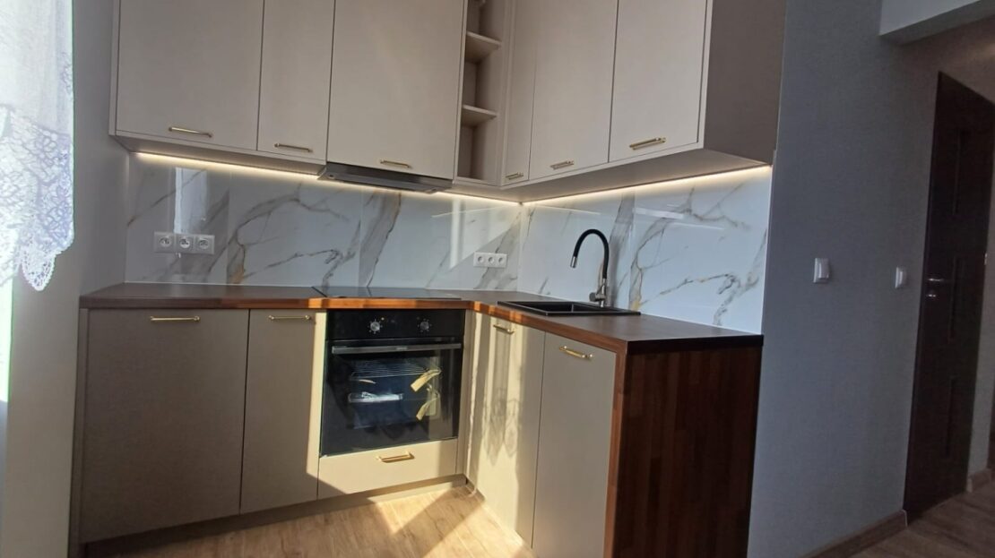 Funkcjonalna kuchnia – meble na wymiar (dwie ściany zabudowane), pełne wyposażenie: lodówka w zabudowie, piekarnik, płyta, okap