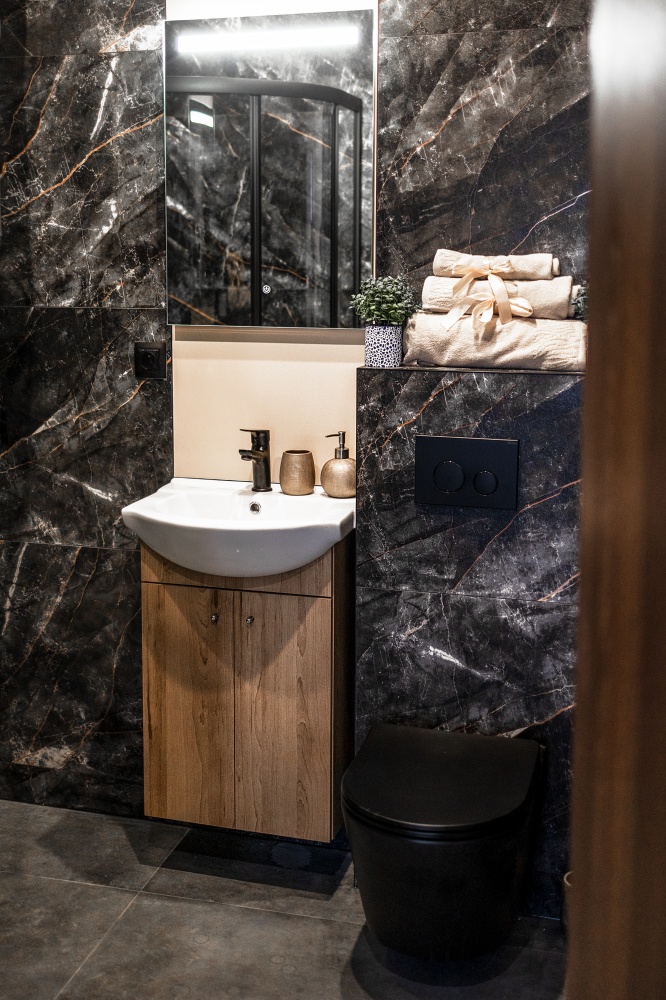 Nowoczesne wnętrze – elegancka łazienka w ciemnych kaflach