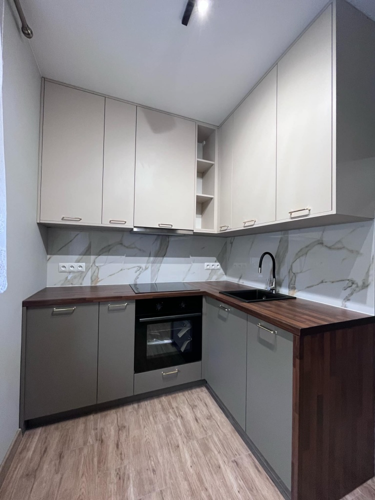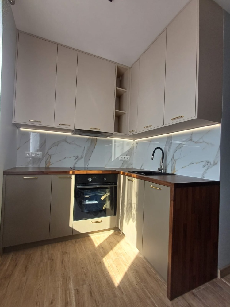 Funkcjonalna kuchnia – meble na wymiar (dwie ściany zabudowane), pełne wyposażenie: lodówka w zabudowie, piekarnik, płyta, okap