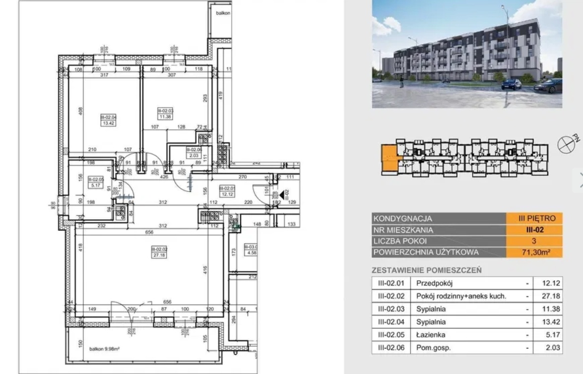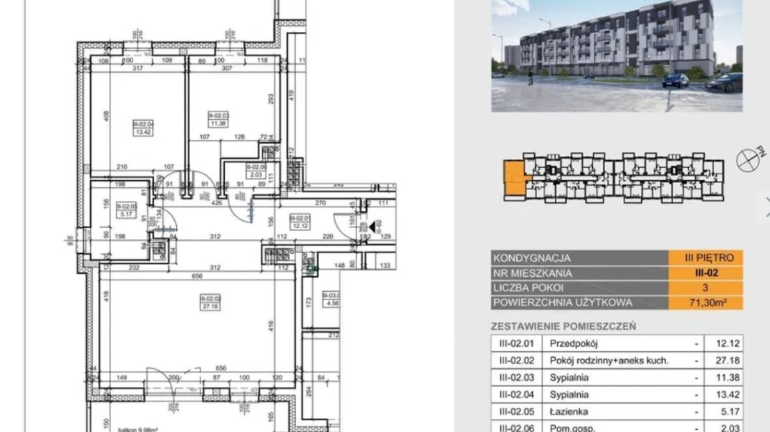 Powierzchnia mieszkania 71,30 m2, na którą składają się: