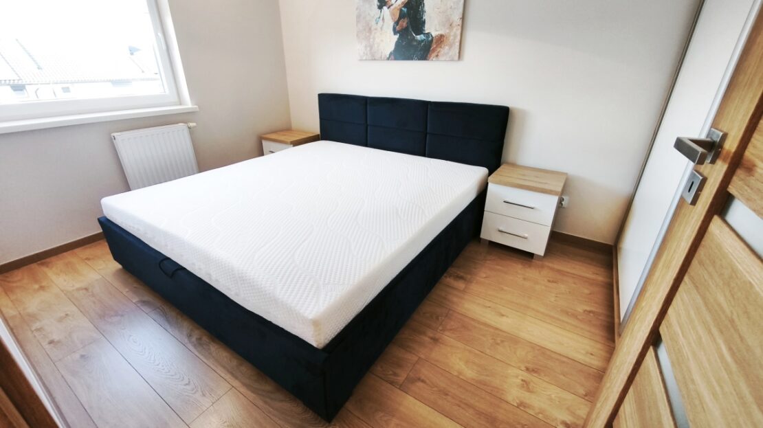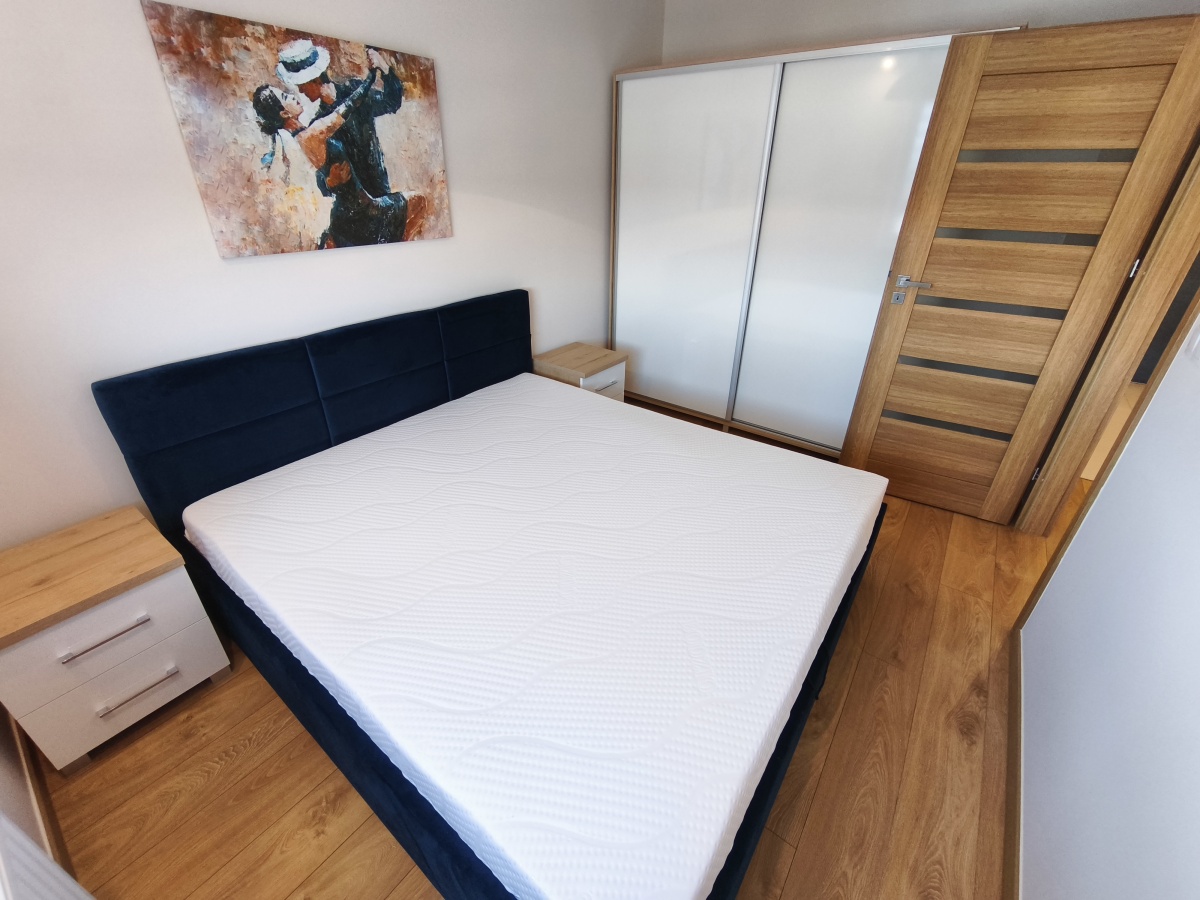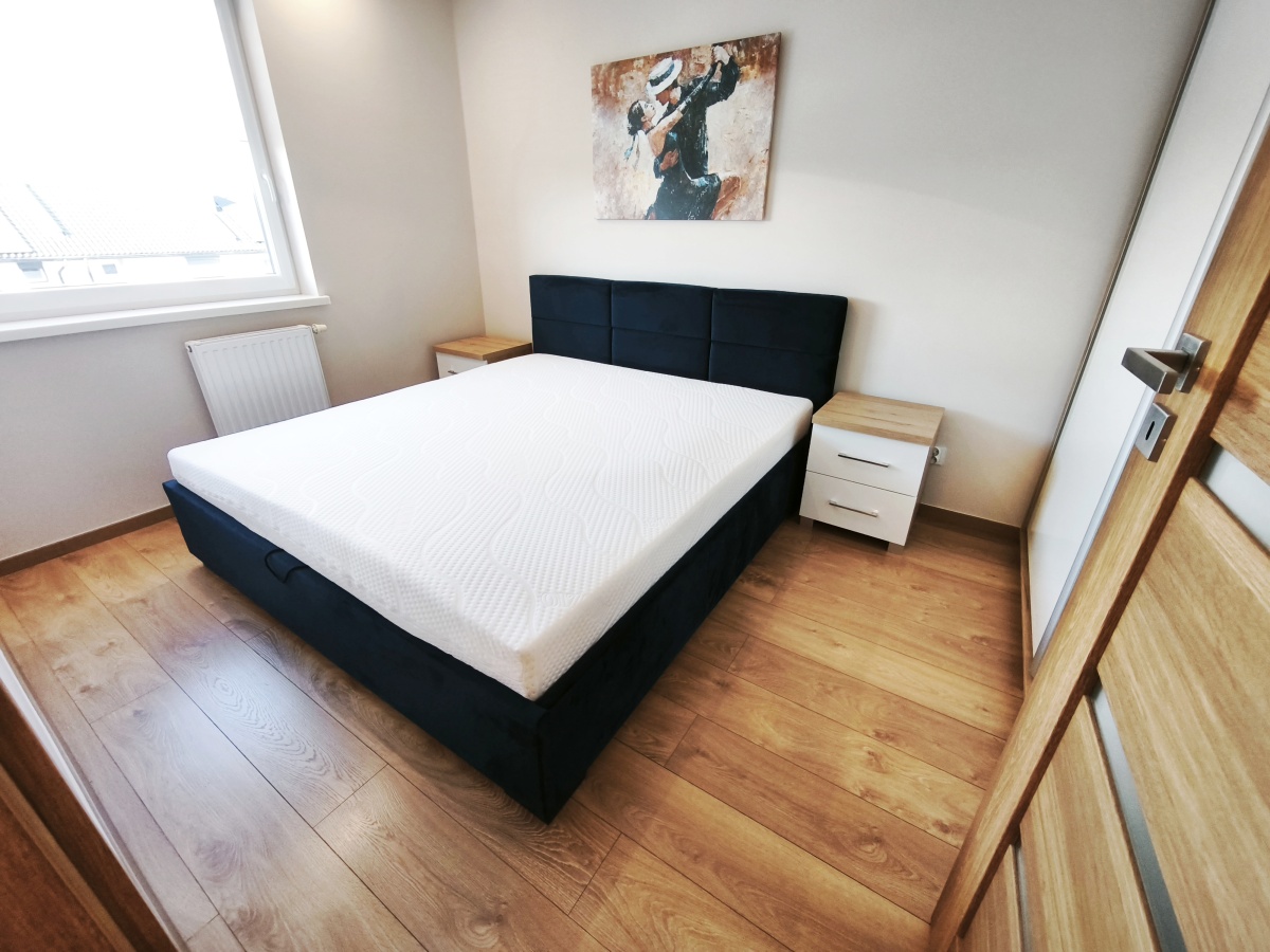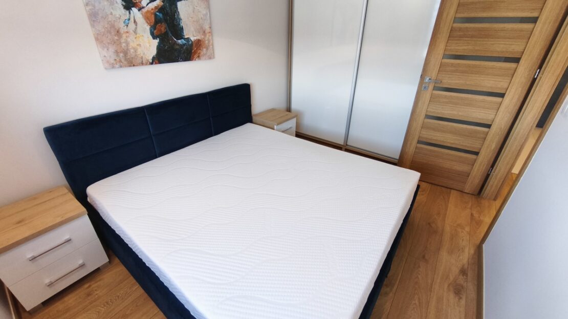 -Duże nowe wygodne łóżko wraz z nowym materacem w sypialni, stoliki nocne, szafa i dodatek w postaci obrazu na łóżkiem tworzą atmosferę relaksu i spokoju.
