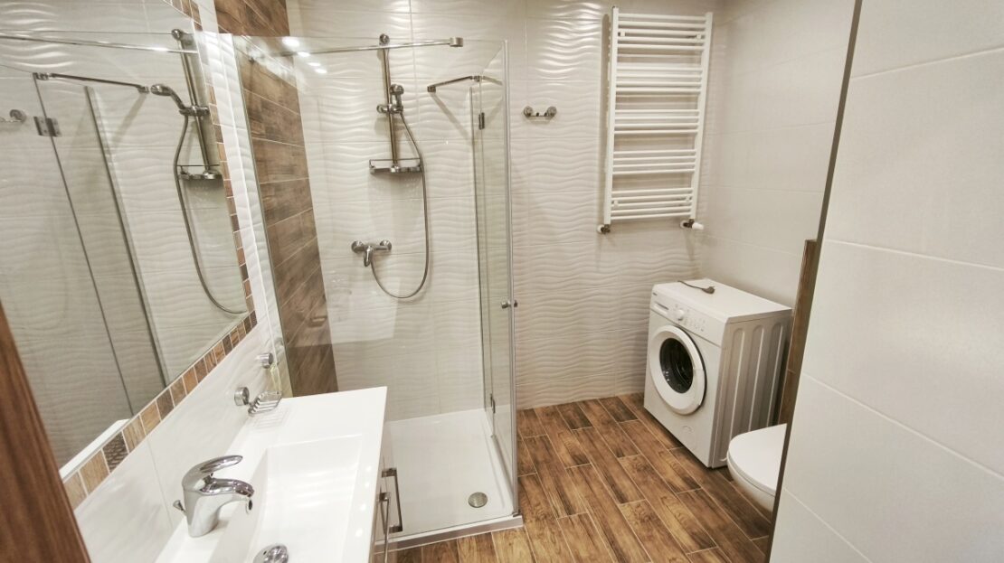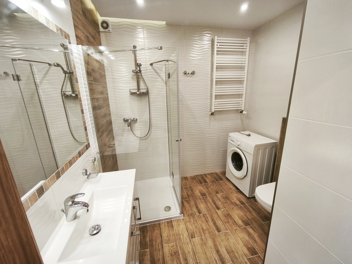 -Komfortowa łazienka z dużym prysznicem w pełni wyposażona wraz z pralką.