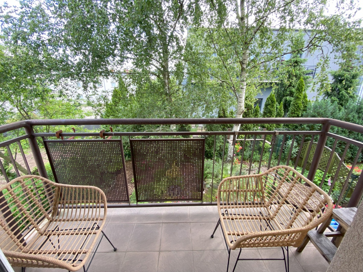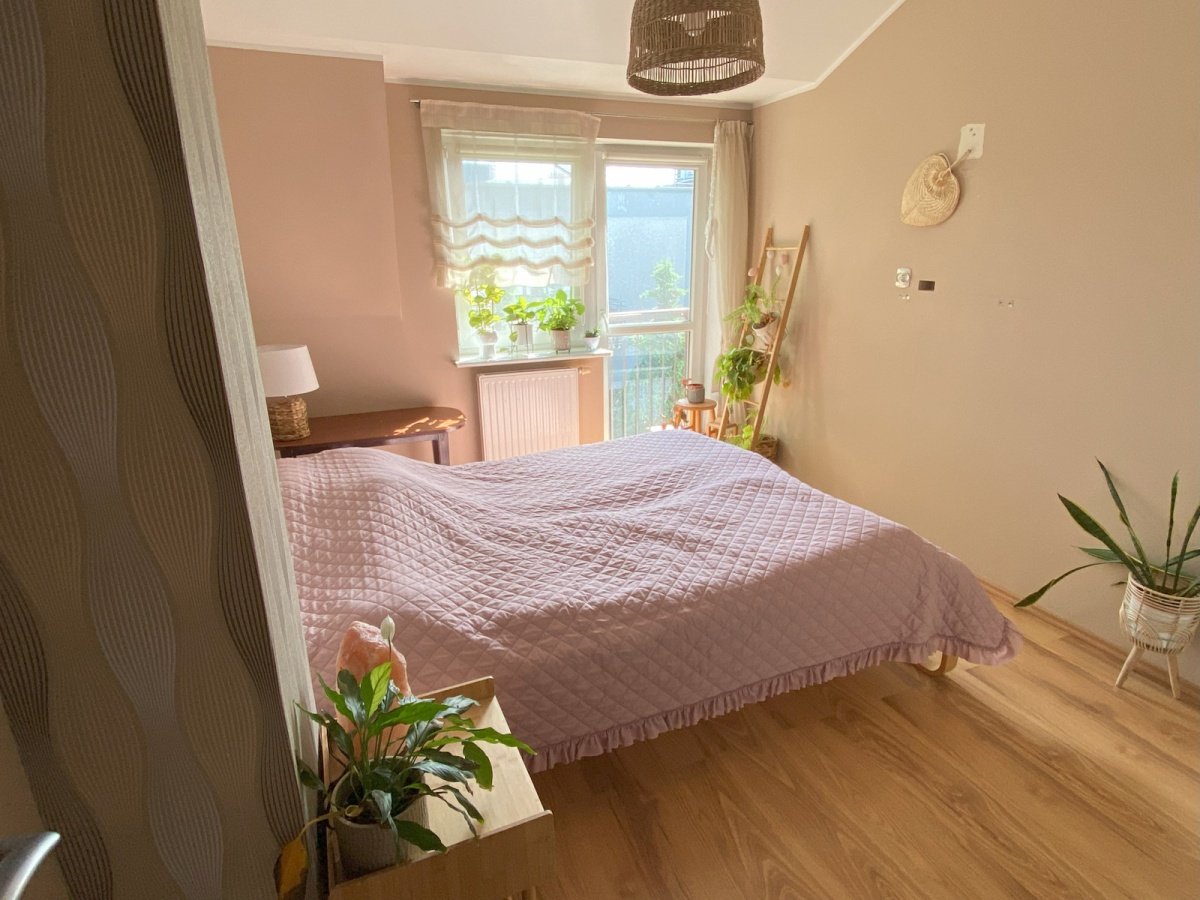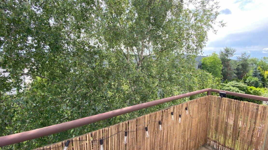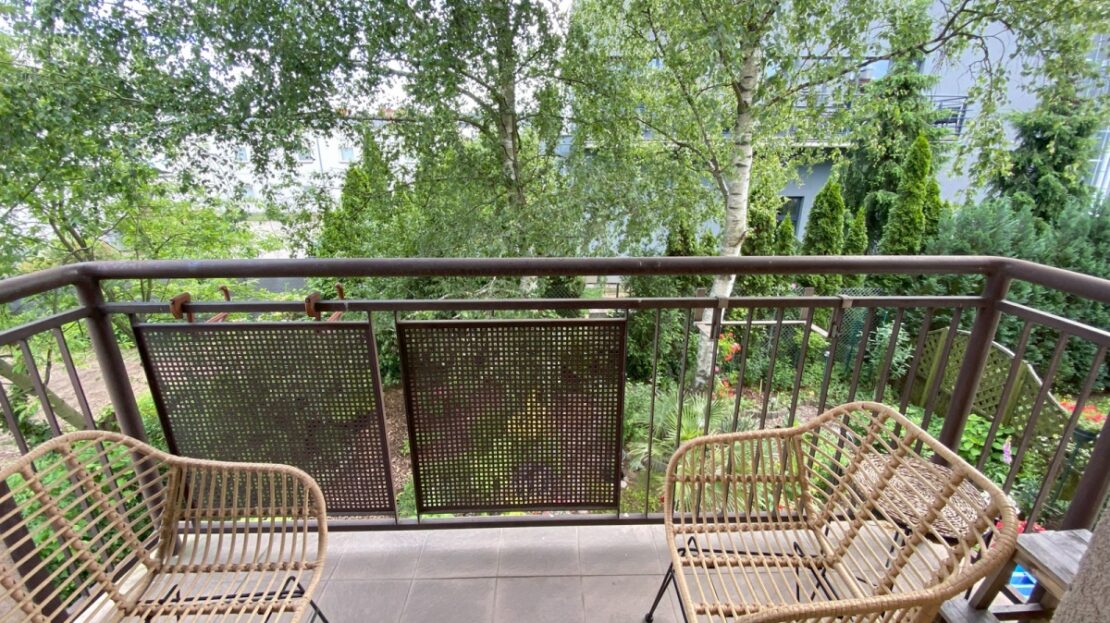 W skład mieszkania wchodzą trzy ustawne pokoje, salon z aneksem kuchennym, dwie łazienki, pomieszczenie gospodarcze oraz dwa balkony z pięknym widokiem na ogród i drzewa. Mieszkanie jest w pełni umeblowane i gotowe do zamieszkania – wyposażone w zmywarkę, lodówkę, kuchenkę, piekarnik i pralkę. Lokal oferuje bardzo dużo miejsca do przechowywania – w każdym pomieszczeniu znajdują się pojemne szafy, regały lub komody. Mieszkanie jest doskonałą alternatywą dla domu w zabudowie szeregowej.