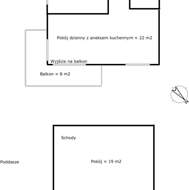 poziom główny: pokój dzienny z aneksem kuchennym, pokój, łazienka, hol ze schodami na poddasze