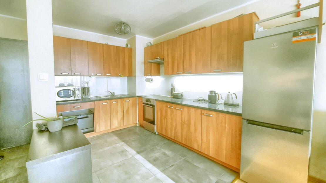 aneks kuchenny: lodówka, kuchenka z piekarnikiem, zmywarka, okap z wyciągiem, meble w zabudowie wysokiej jakości;
