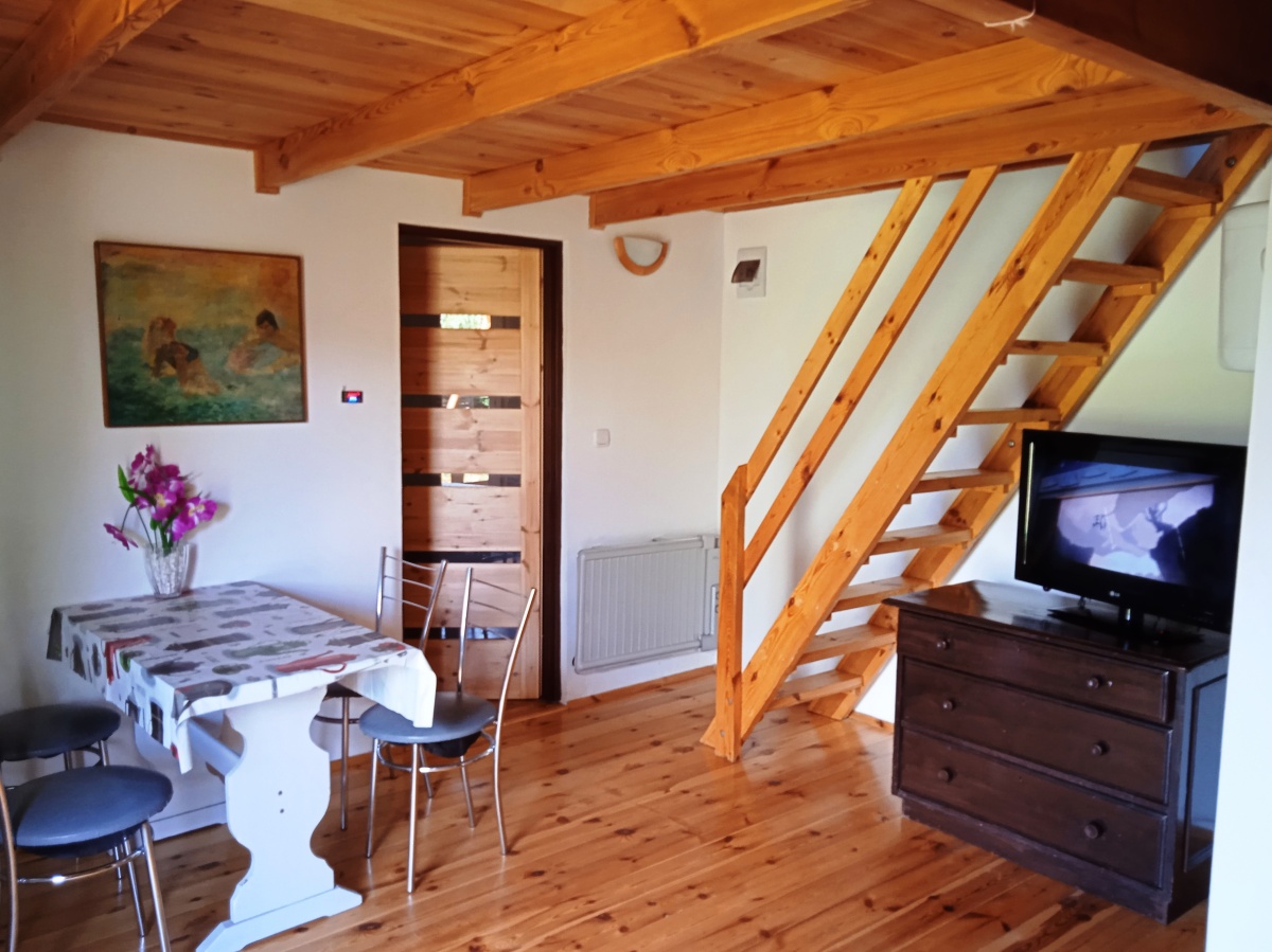 W domku znajduje się salon z aneksem kuchennym, łazienką ,oraz 2 pokoje ( jeden na parterze drugi na poddaszu).