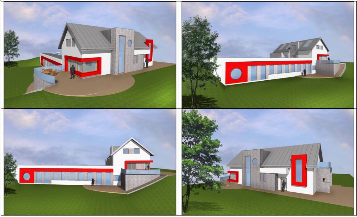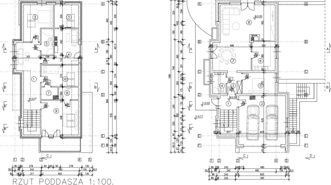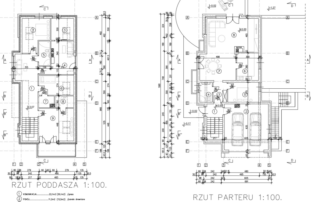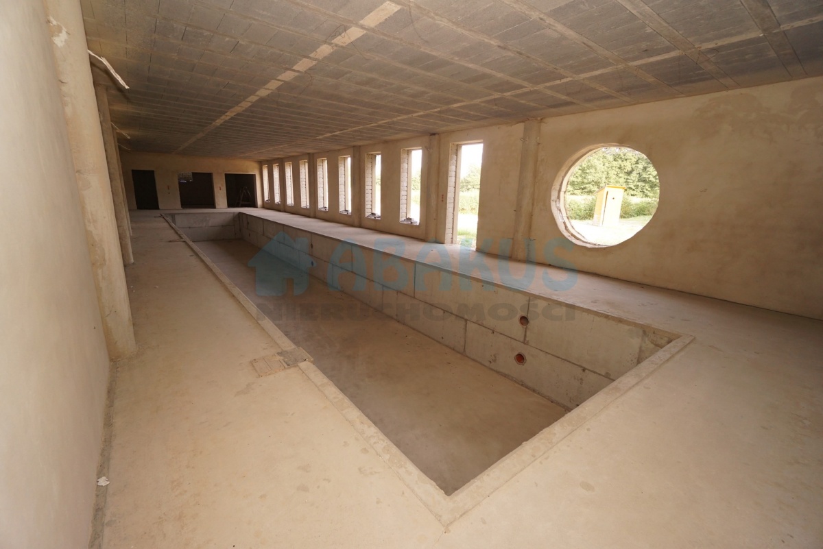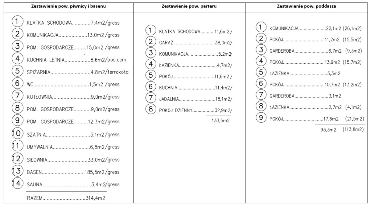 Budynek podzielony na część dzienną zlokalizowaną na parterze o pow. 133,50 m2, część sypialną na poddaszu o pow. 93,30 m2 oraz część rekreacyjną (siłownia, basen o wymiarach 3,40m x 20m, głęb. 1,35 m) zlokalizowaną w piwnicy o pow. 314,40 m2.