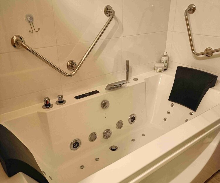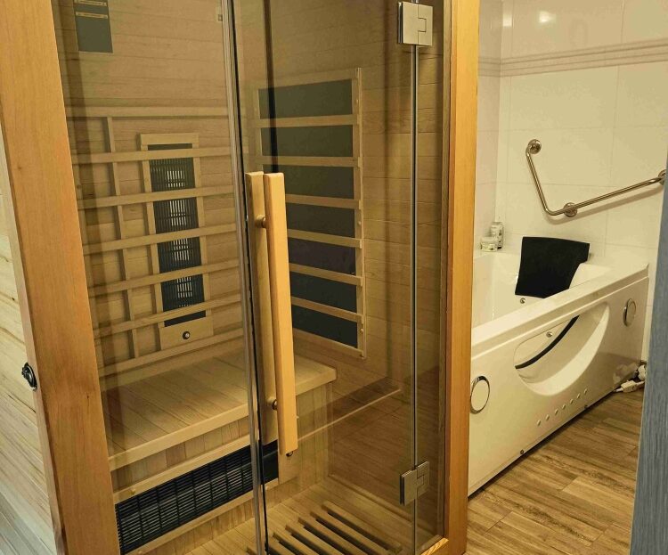Ponadto na dolnej kondygnacji znajduje się duża kotłownia, pralnia, pomieszczenie gospodarcze, spiżarnia oraz wanna z hydromasażem dla dwóch osób i sucha sauna również dla 2 osób.