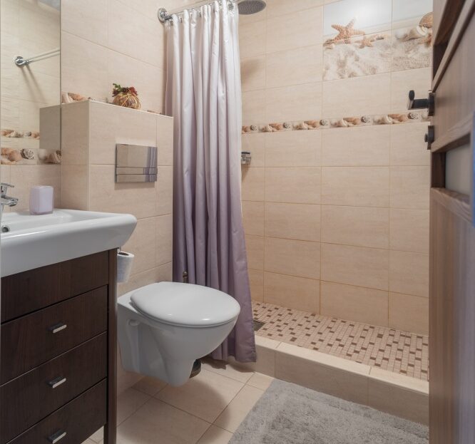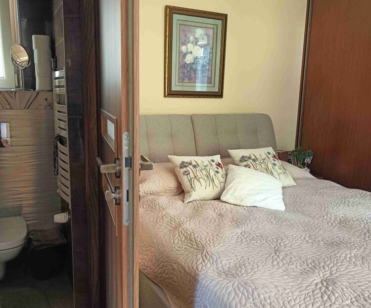 Na piętrze jest duży salon z dużą otwartą kuchnią i pełną łazienką, oraz sypialnia z połową łazienki.