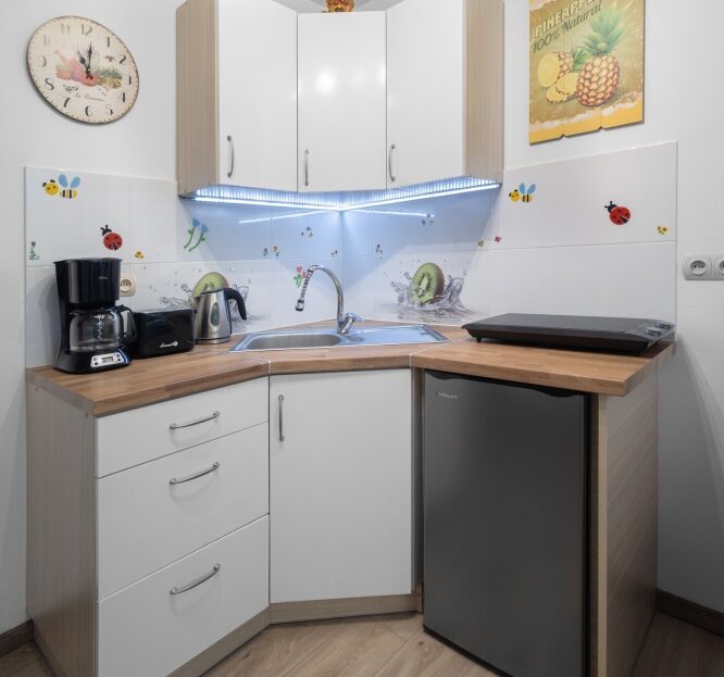 Na parterze znajduje się duży salon z aneksem kuchennym, sypialnia, oraz łazienka z prysznicem, oraz garaż przylegający do budynku otwierany pilotem.
