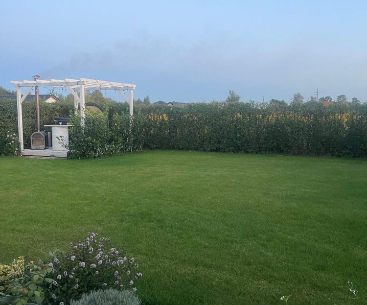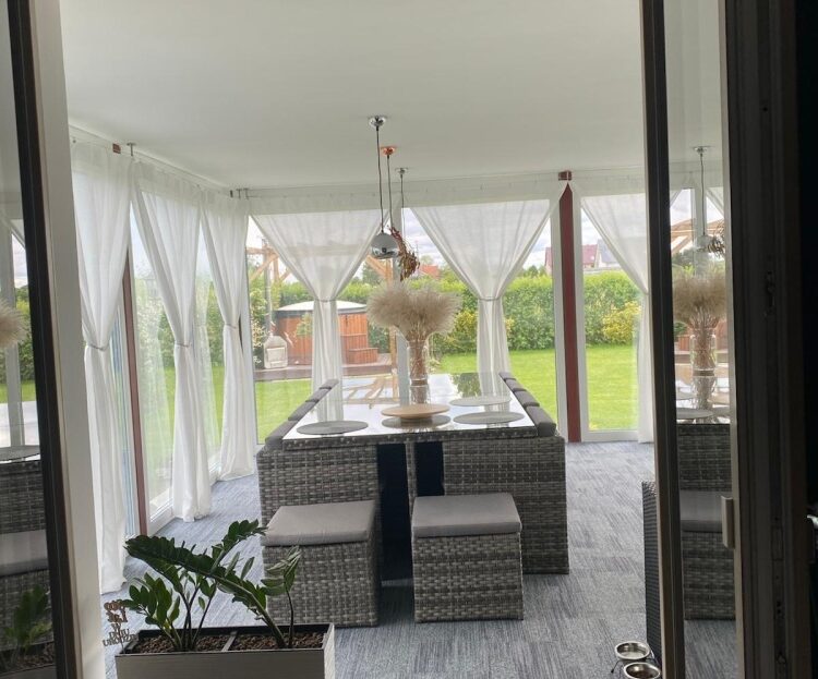 • Duży taras przylegający do ogrodu zimowego, jest idealnym miejscem na letnie grillowanie, poranną kawę lub spotkania z przyjaciółmi. Jest on wyposażony w duży drewniany stół z ławkami mieszczący 16 osób.