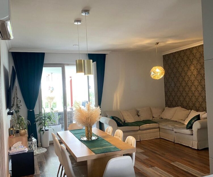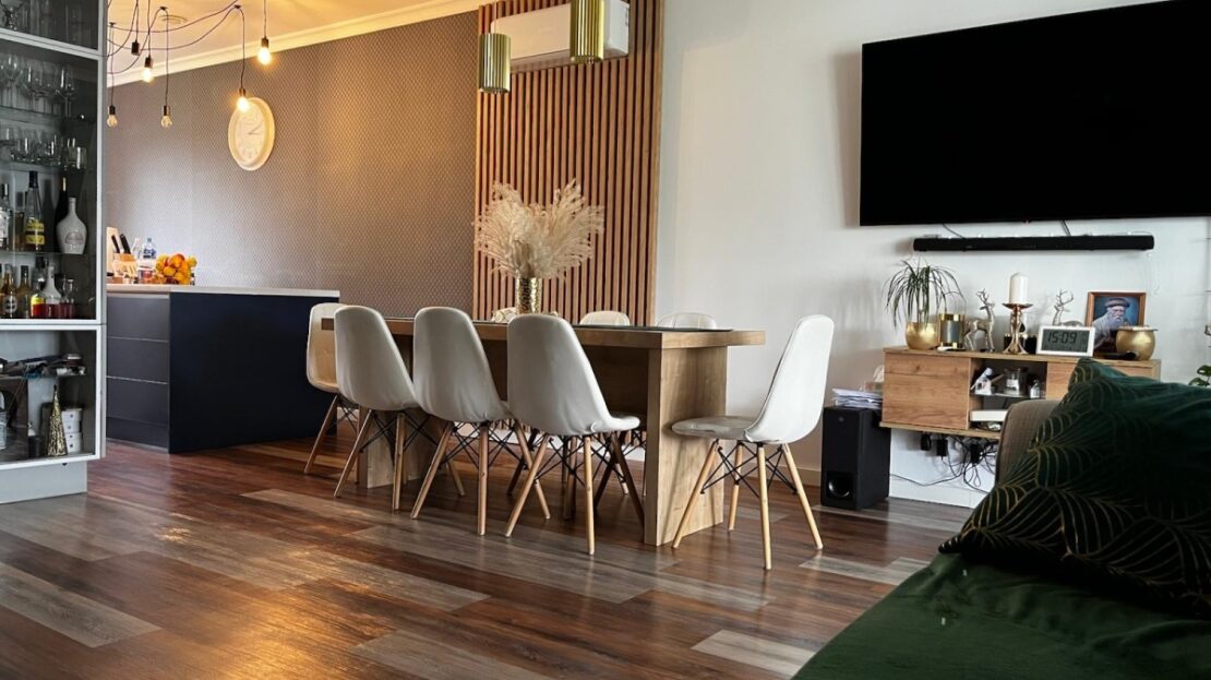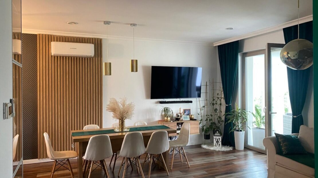 • Kuchnia z Jadalnią: Kuchnia, mimo że połączona z salonem, jest funkcjonalna. Posiada nowoczesną zabudowę, dużo blatu roboczego i miejsca na sprzęty AGD. Wyspa kuchenna to idealne miejsce do szybkiego śniadania i interakcji z gośćmi. Tuż obok znajduje się jadalnia, z dużym stołem, który z łatwością pomieści całą rodzinę. Otwarte połączenie sprzyja wspólnemu spędzaniu czasu i integracji.