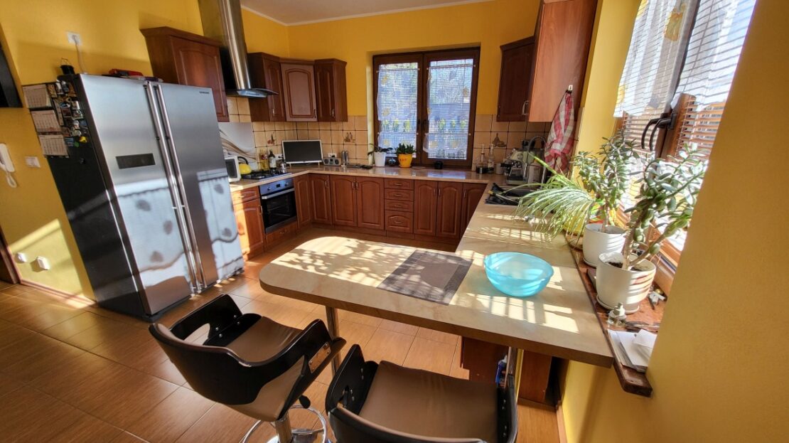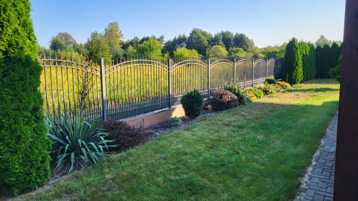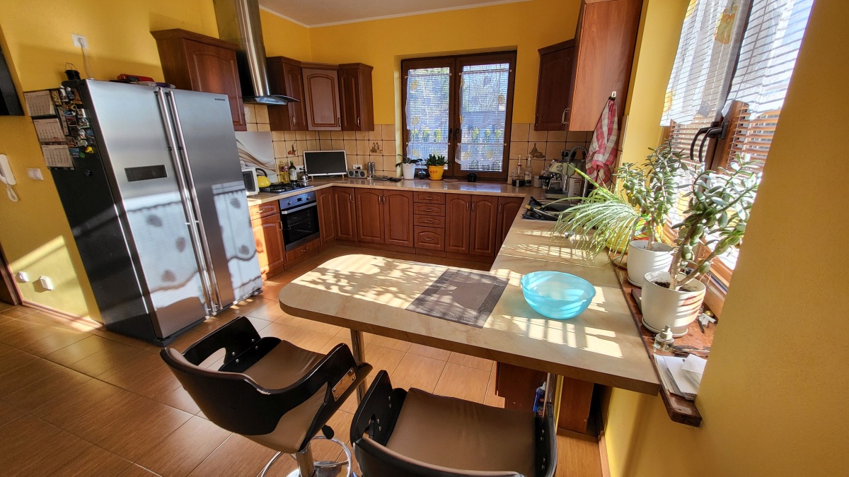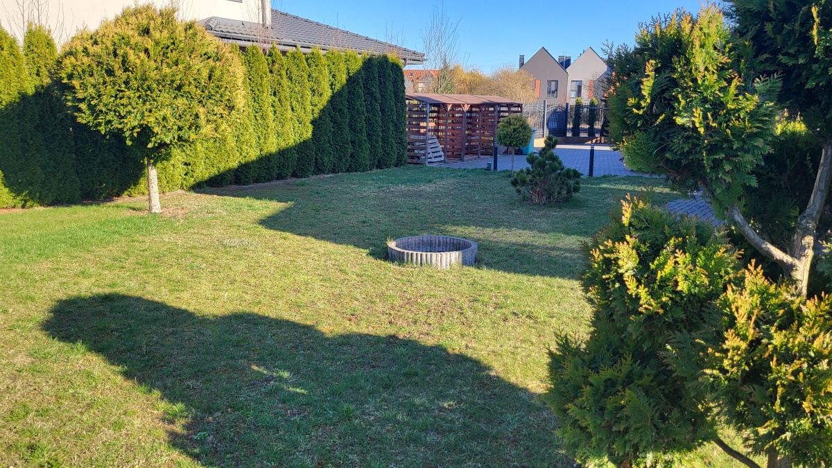 Dom z przyłączem do wszystkich mediów z bezpośrednim dostępem do asfaltowej i oświetlonej drogi gminnej. Wybudowany w roku 2012 na kwadratowej działce o powierzchni 1000 m2. Dom jest ogrodzony przęsłami kutymi z czterech stron. Budynek składa się z 3 pokoi i dużego salonu z antresolą oraz aneksem kuchennym i jadalnią. Kominek z płaszczem wodnym oraz buforem ciepła o pojemności 1000 litrów z pełną automatyką. Pozostałe pomieszczenia na parterze to pokój, wiatrołap, łazienka oraz pomieszczenie gospodarcze prowadzące do garażu. Na piętro prowadzą dębowe ażurowe schody, gdzie znajdują się 2 sypialnie i duża łazienka, oraz duże pomieszczenie obecnie adoptowane na pralnię z suszarnią. W wydzielonej części holu znajdują się przyrządy fitness (bieżnia, rower eliptyczny firmy York). Jedno z okien dachowych (Velux) nad salonem jest sterowane pilotem z czujnikiem deszczu. Wszystkie 3 pokoje oraz salon posiadają klimatyzację (multisplit Samsung). We wszystkich pomieszczeniach na parterze jest ogrzewanie podłogowe. Obie łazienki mają również ogrzewanie podłogowe oraz kaloryfery drabinkowe. W pomieszczeniu gospodarczym zainstalowana jest stacja zmiękczania wody (cała armatura grzewczo hydrauliczna firmy Viessmann). Bezpośrednio z jadalni wychodzi się na wielki 56 m taras (częściowo zadaszony) z cudownym widokiem na las. Dom wyposażony jest także w odkurzacz centralny oraz garaż dwustanowiskowy. Na dachu budynku zamontowany jest próżniowy panel solarny do podgrzewania wody użytkowej. W ogrodzie jest domek na narzędzia i drewutnia. Działka posiada automatyczne nawadnianie ogrodu (Gardena) oraz siatkę przeciw kretom na całej powierzchni trawnika. Na działce wydzielone jest również miejsce na ognisko. Nad bezpieczeństwem czuwa alarm trzystrefowy (czujki wewnętrzne, kontaktrony w oknach i czujki zewnętrzne). Wyposażenie domu częściowo podlega sprzedaży wraz z domem, szczegóły do uzgodnienia.