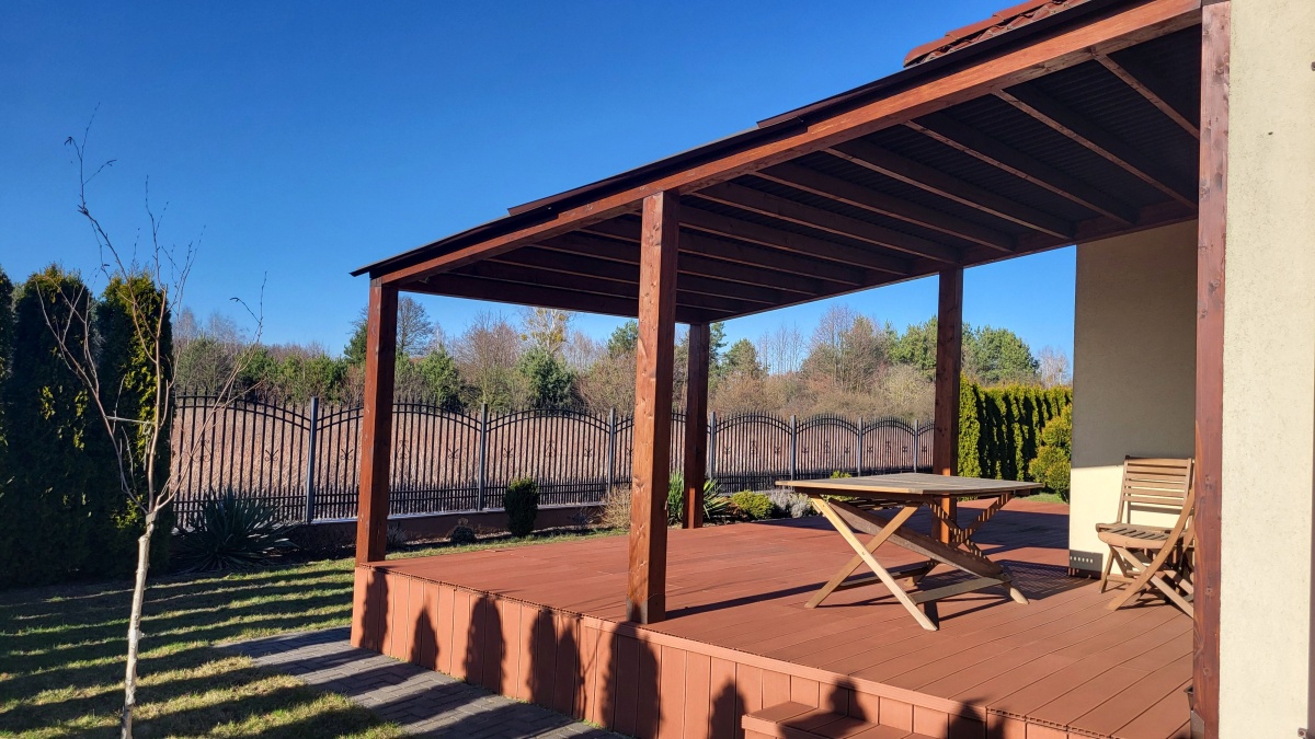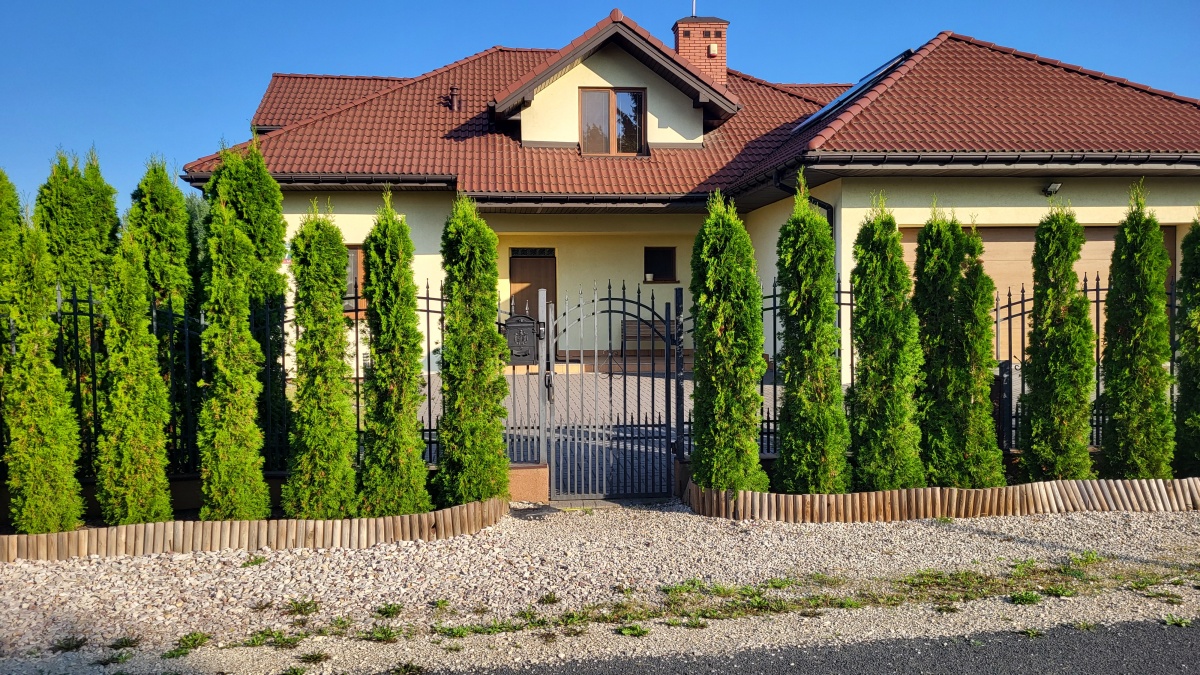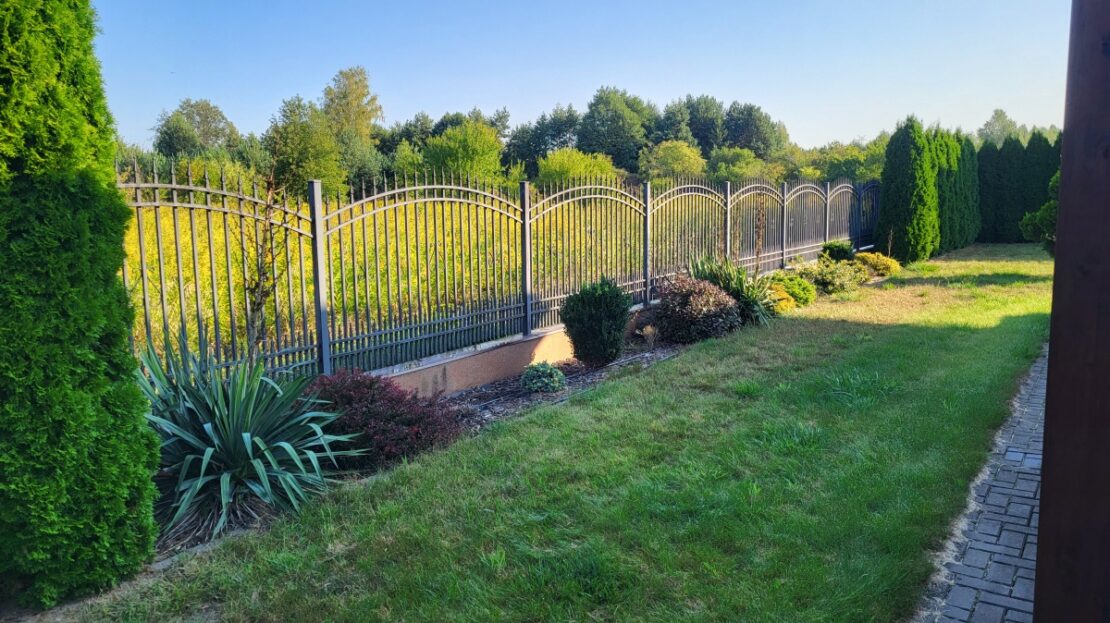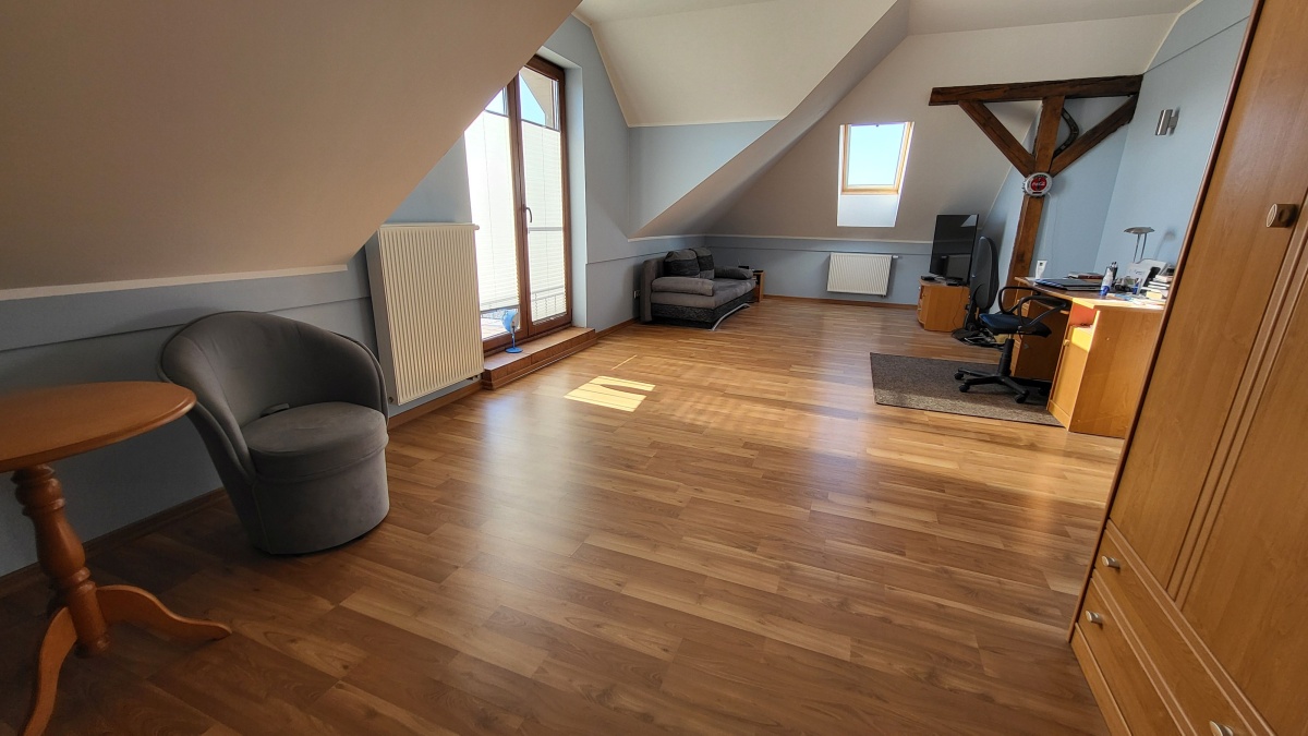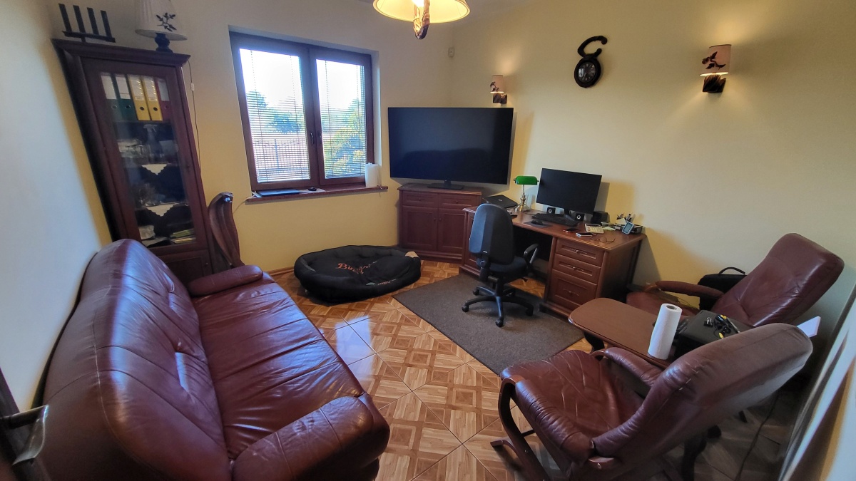 Dom z przyłączem do wszystkich mediów z bezpośrednim dostępem do asfaltowej i oświetlonej drogi gminnej. Wybudowany w roku 2012 na kwadratowej działce o powierzchni 1000 m2. Dom jest ogrodzony przęsłami kutymi z czterech stron. Budynek składa się z 3 pokoi i dużego salonu z antresolą oraz aneksem kuchennym i jadalnią. Kominek z płaszczem wodnym oraz buforem ciepła o pojemności 1000 litrów z pełną automatyką. Pozostałe pomieszczenia na parterze to pokój, wiatrołap, łazienka oraz pomieszczenie gospodarcze prowadzące do garażu. Na piętro prowadzą dębowe ażurowe schody, gdzie znajdują się 2 sypialnie i duża łazienka, oraz duże pomieszczenie obecnie adoptowane na pralnię z suszarnią. W wydzielonej części holu znajdują się przyrządy fitness (bieżnia, rower eliptyczny firmy York). Jedno z okien dachowych (Velux) nad salonem jest sterowane pilotem z czujnikiem deszczu. Wszystkie 3 pokoje oraz salon posiadają klimatyzację (multisplit Samsung). We wszystkich pomieszczeniach na parterze jest ogrzewanie podłogowe. Obie łazienki mają również ogrzewanie podłogowe oraz kaloryfery drabinkowe. W pomieszczeniu gospodarczym zainstalowana jest stacja zmiękczania wody (cała armatura grzewczo hydrauliczna firmy Viessmann). Bezpośrednio z jadalni wychodzi się na wielki 56 m taras (częściowo zadaszony) z cudownym widokiem na las. Dom wyposażony jest także w odkurzacz centralny oraz garaż dwustanowiskowy. Na dachu budynku zamontowany jest próżniowy panel solarny do podgrzewania wody użytkowej. W ogrodzie jest domek na narzędzia i drewutnia. Działka posiada automatyczne nawadnianie ogrodu (Gardena) oraz siatkę przeciw kretom na całej powierzchni trawnika. Na działce wydzielone jest również miejsce na ognisko. Nad bezpieczeństwem czuwa alarm trzystrefowy (czujki wewnętrzne, kontaktrony w oknach i czujki zewnętrzne). Wyposażenie domu częściowo podlega sprzedaży wraz z domem, szczegóły do uzgodnienia.