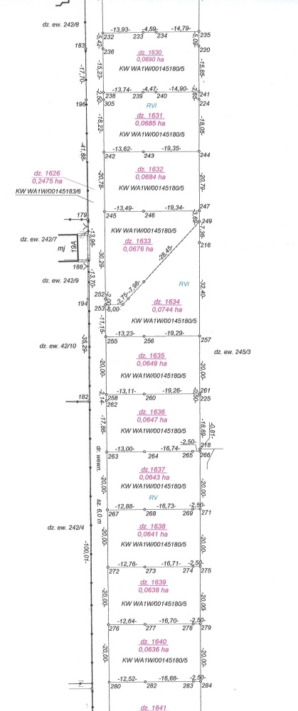 Działki mają regularny kształt (wymiary: szerokość od 20 do 21m, długość od 32 do 33m.) i atrakcyjne powierzchnie — od 636 do 744 m² (możliwość wyboru).