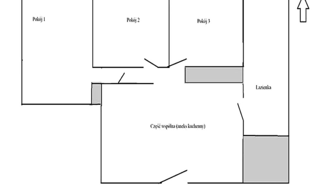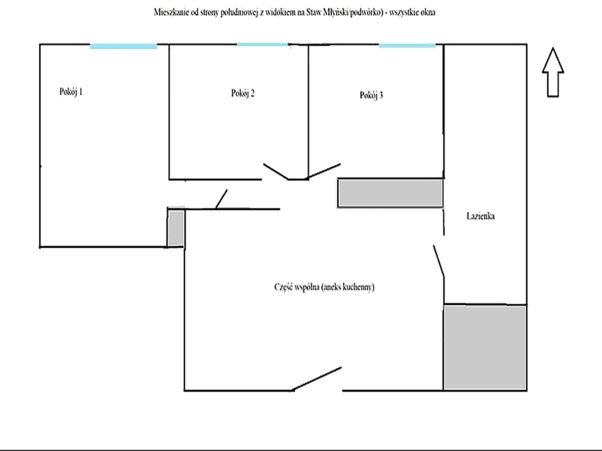 Mieszkanie ma 55,55m2, 3 niezależne pokoje, spora łazienka, część wspólna (kuchnia).