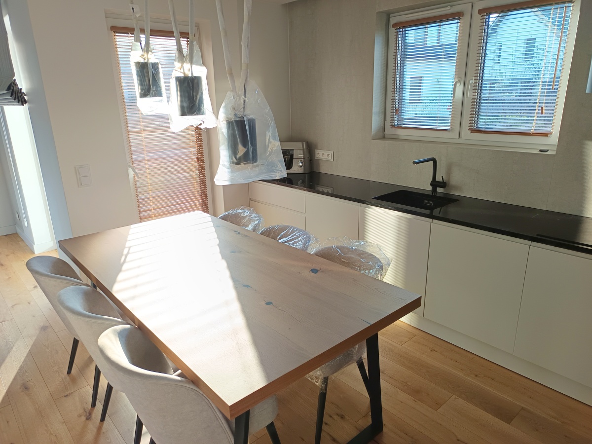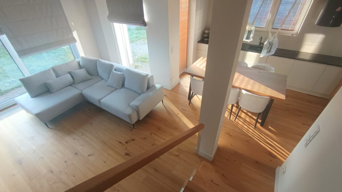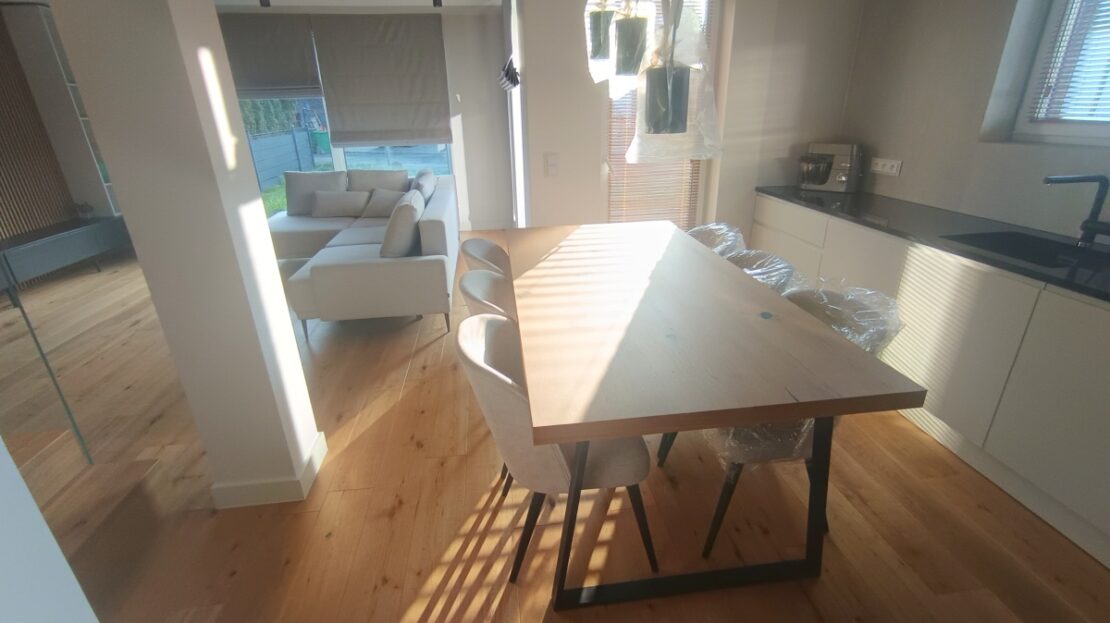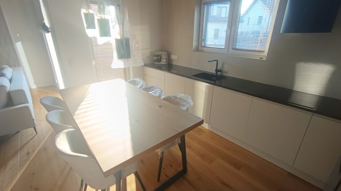 Jasna kuchnia wyposażona we wszystkie niezbędne sprzęty. Na piętrze trzy sypialnie, możliwość wykorzystania jednej na gabinet.