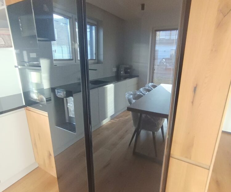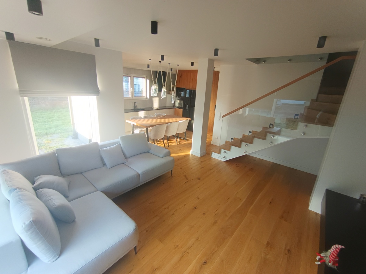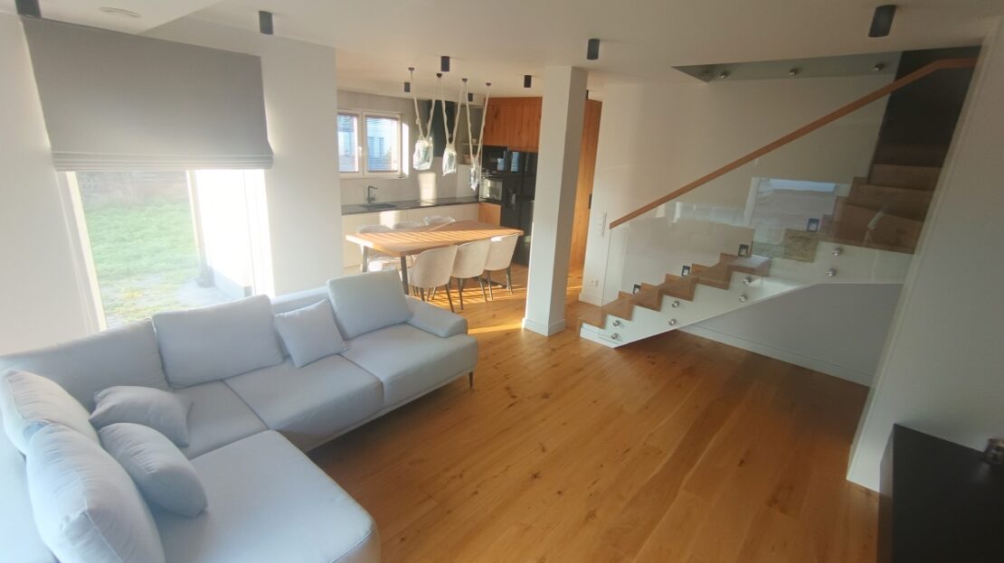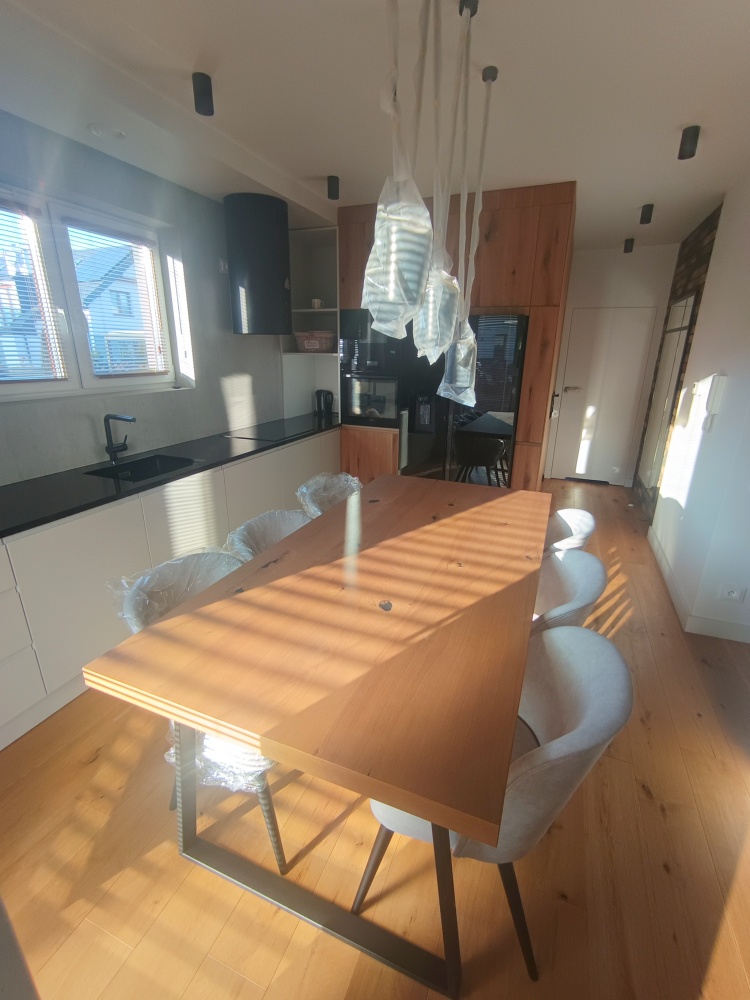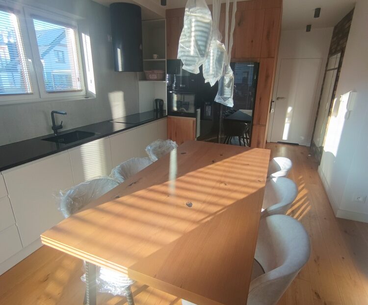 Jasna kuchnia wyposażona we wszystkie niezbędne sprzęty. Na piętrze trzy sypialnie, możliwość wykorzystania jednej na gabinet.