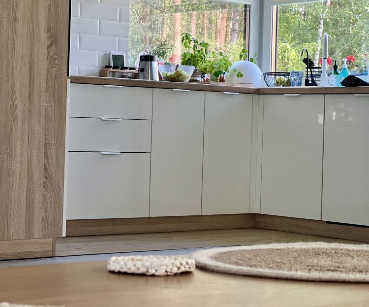 Przestronna kuchnia (Blum, GTX) z oknem narożnym, widokiem na ogród i nowoczesnym wyposażeniem to serce domu – tu rodzą się rodzinne historie. Jasne, przytulne wnętrza i detale, jak artystyczna fototapeta, tworzą przyjazną przestrzeń.