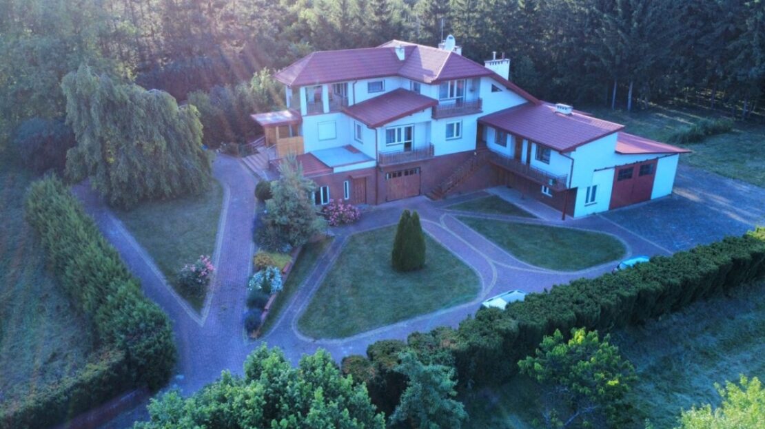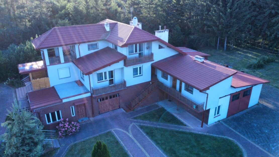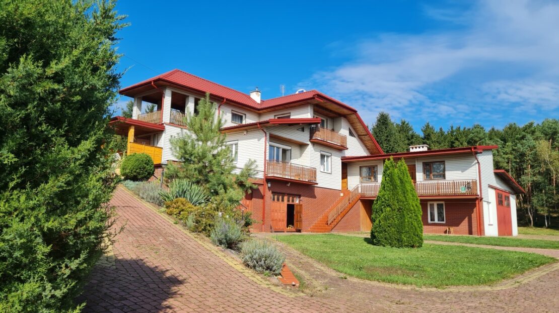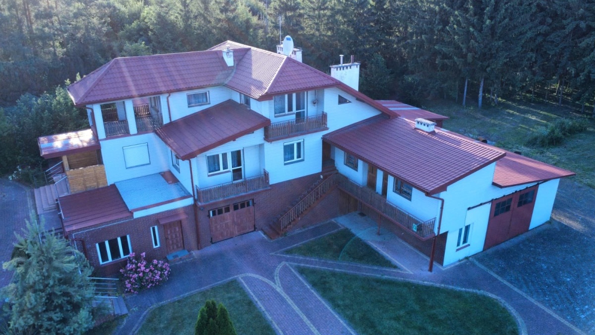 Dom składa się z 3 osobnych części. Pierwsza, jednopoziomowa z dziedzińcowym podjazdem, składa się z wiatrołapu, salonu z kominkiem i otwartą kuchnią, sypialni, pokoju. Okna na wschód, południe i zachód. Nadaje się do zamieszkania od zaraz. Druga, dwupoziomowa, z osobnym wejściem, stan surowy, na parterze łazienka, kuchnia, salon, na piętrze 3 pokoje, wc ( do ewentualnej rozbudowy z części strychu). Okna na cztery strony świata. Trzecia to tzw. letnia kuchnia z łazienką na parterze i dwa pokoiki z umywalkami na piętrze (osobne wejścia). Okna na południe. Budynek jest podpiwniczony, posiada garaż oraz dużą halę gospodarczą, kotłownię gazowo-olejową oraz piec na drewno i węgiel , wiatę na drewno. Na parterze, w stanie surowym, basen wewnętrzny o głębokości 1,50m.