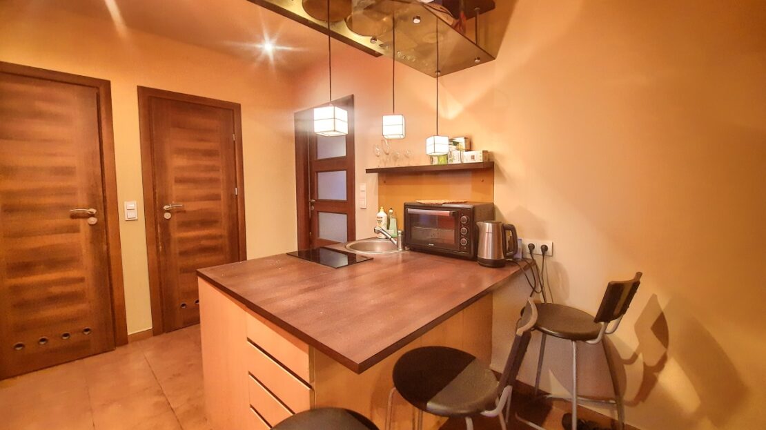Aneks kuchenny umeblowany meblami na wymiar – wyspa, z wbudowanymi sprzętami AGD, zmywarką, kuchenką dwu płytową, lodówką. Nad wyspą zamontowany został sufit podwieszany z wmontowanymi reflektorami halogenowymi. Istnieje możliwość podłączenia większej czteropłytowej płyty grzewczej oraz piekarnika.