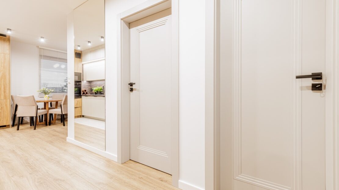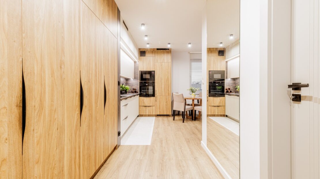 51m2 – salon z aneksem kuchennym, 2 sypialnie, łazienka oraz korytarz.