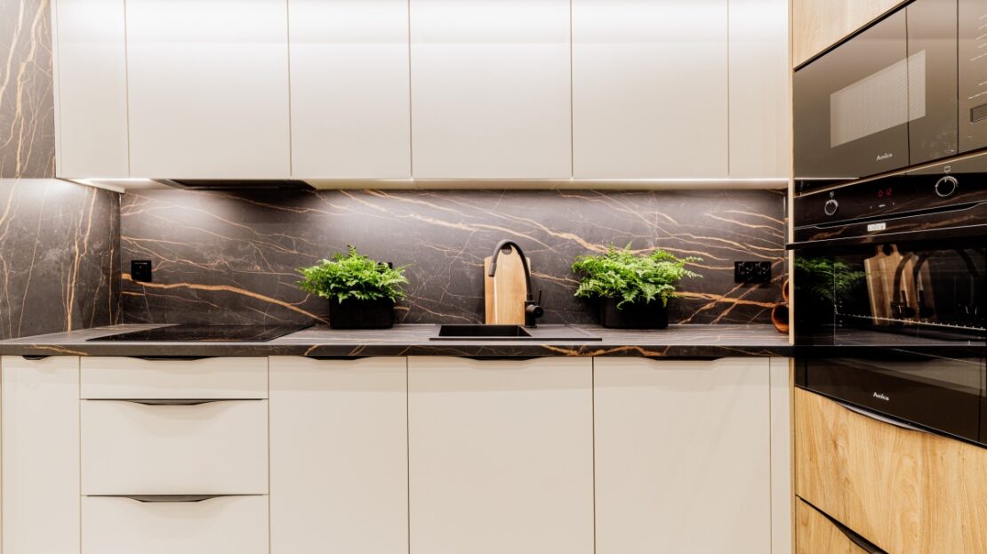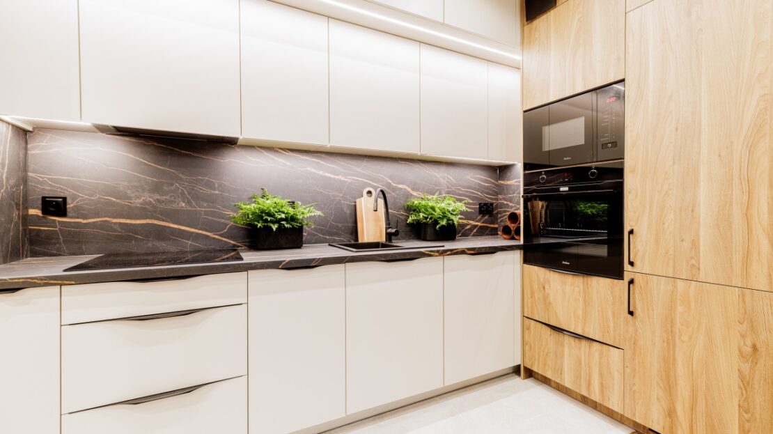 W cenie nowe AGD: płyta indukcyjna, piekarnik oraz mikrofalówka w zabudowie.