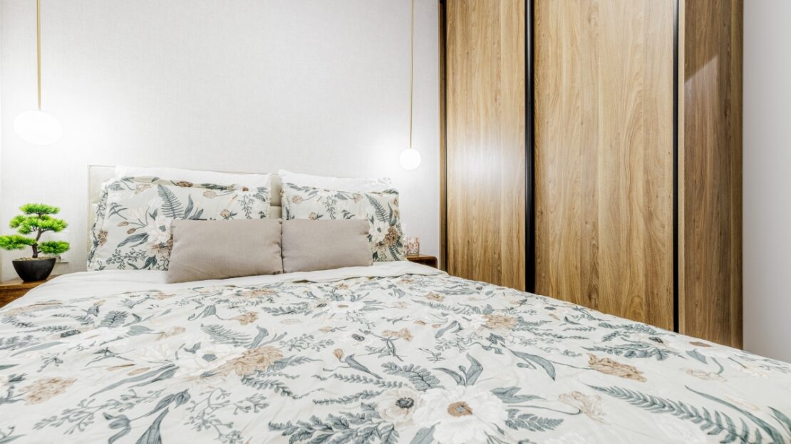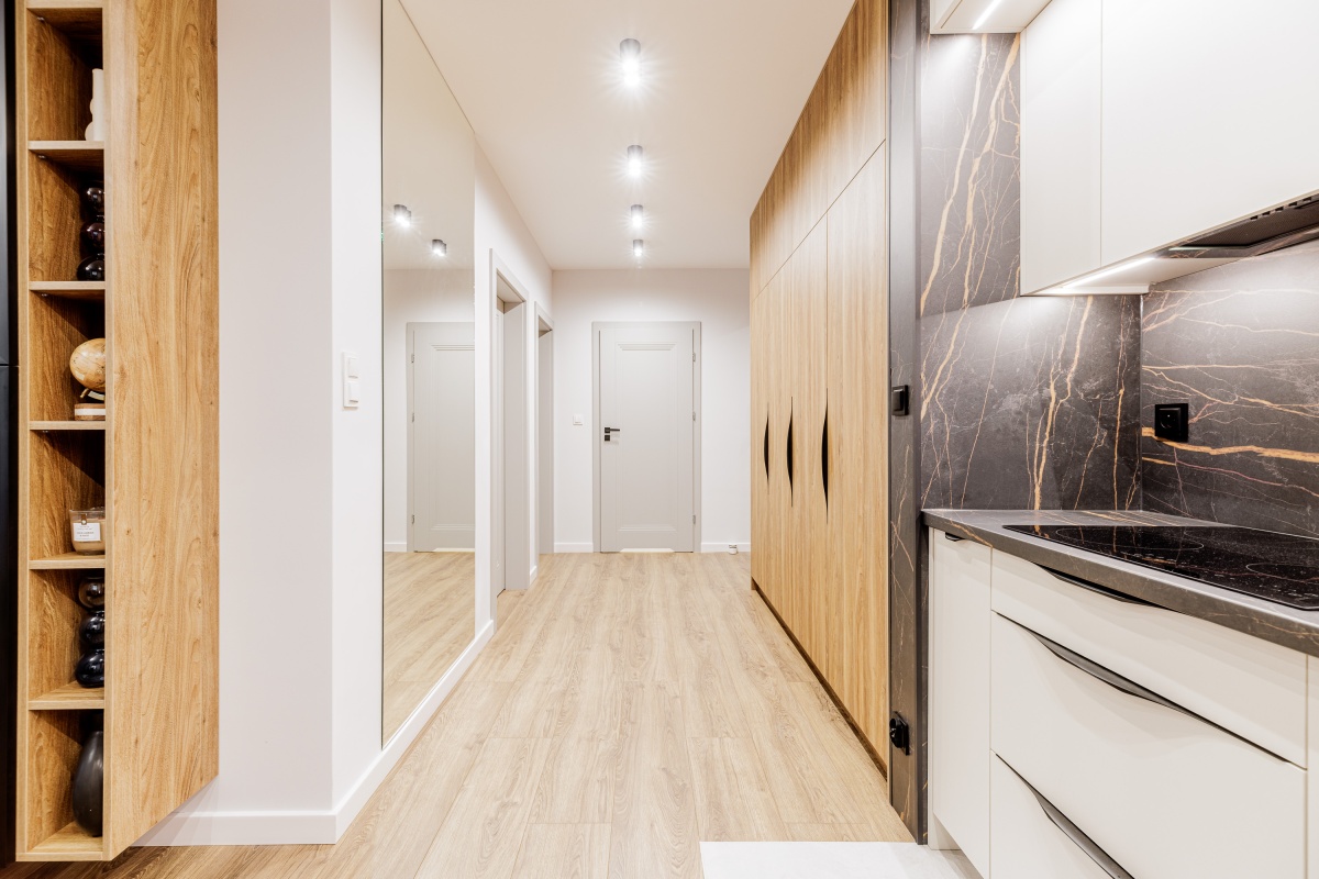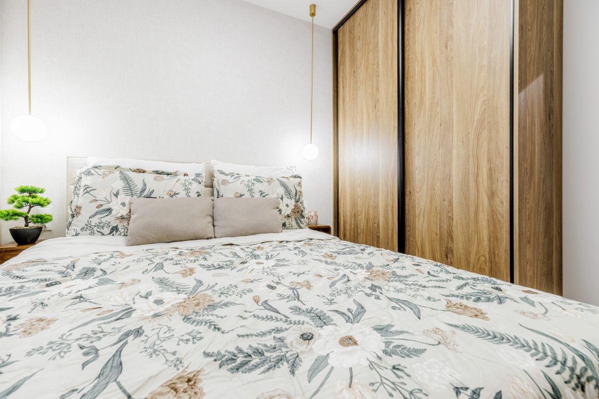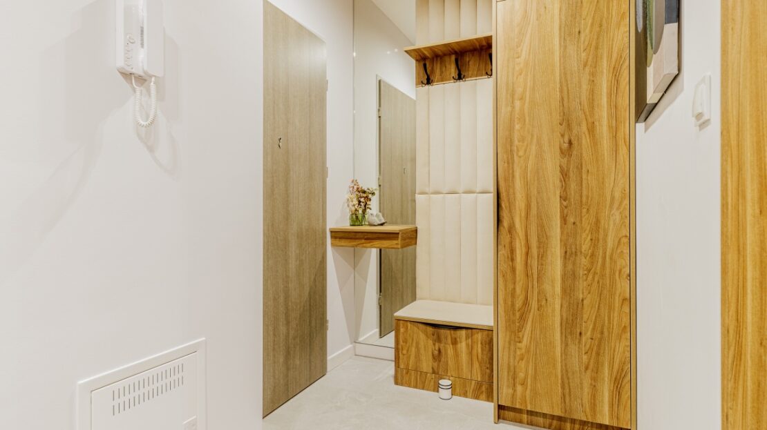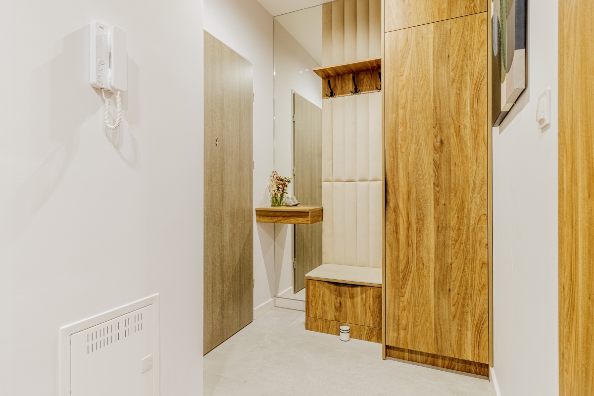 W korytarzu oraz sypialni trzy pojemne szafy na wymiar. W łazience dużo miejsc do przechowywania.