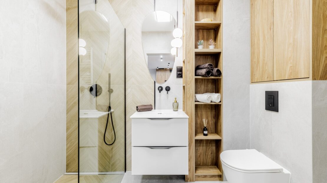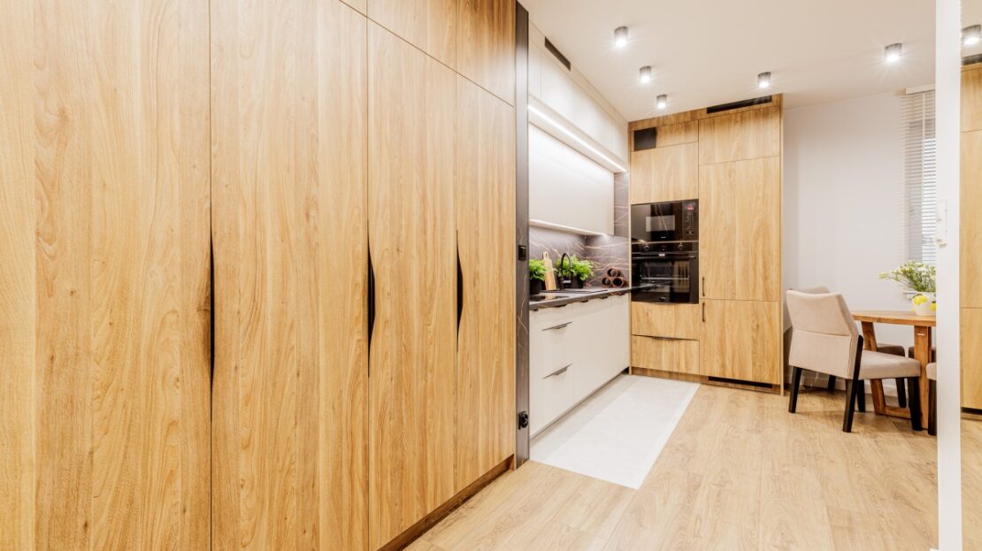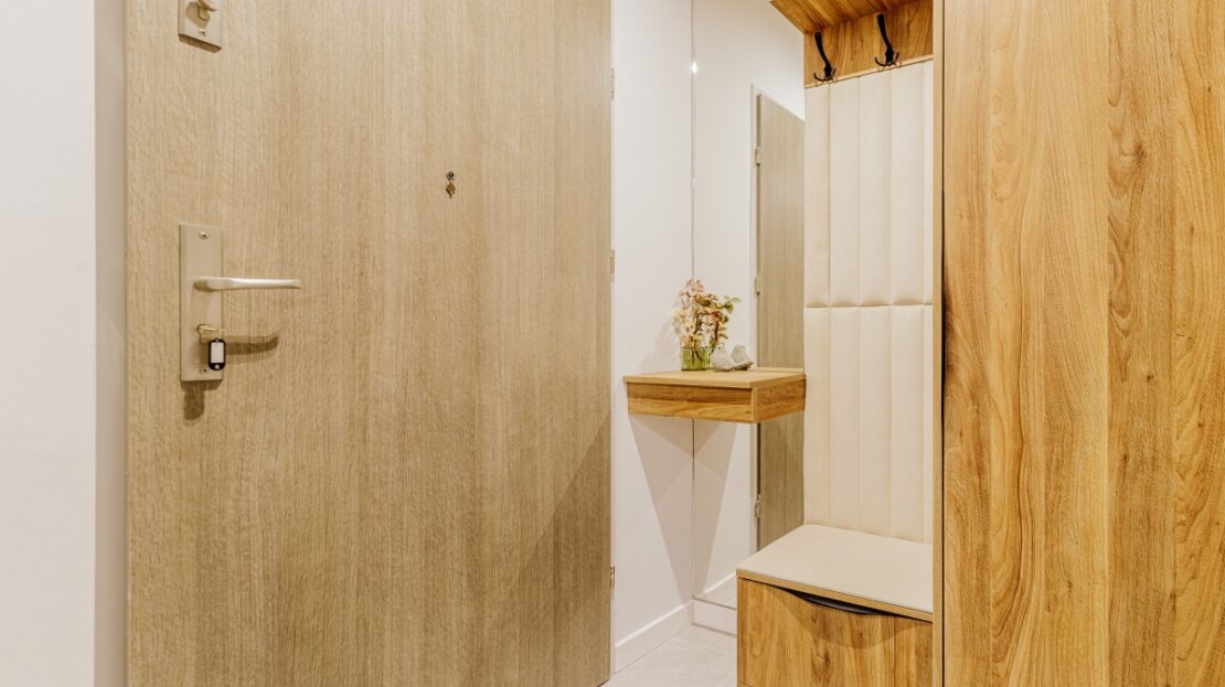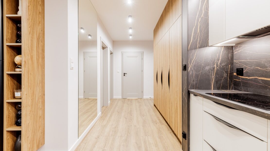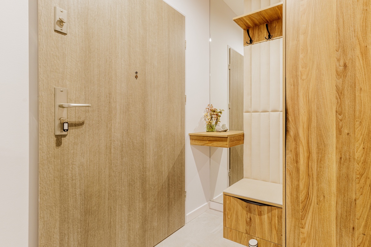 W korytarzu oraz sypialni trzy pojemne szafy na wymiar. W łazience dużo miejsc do przechowywania.