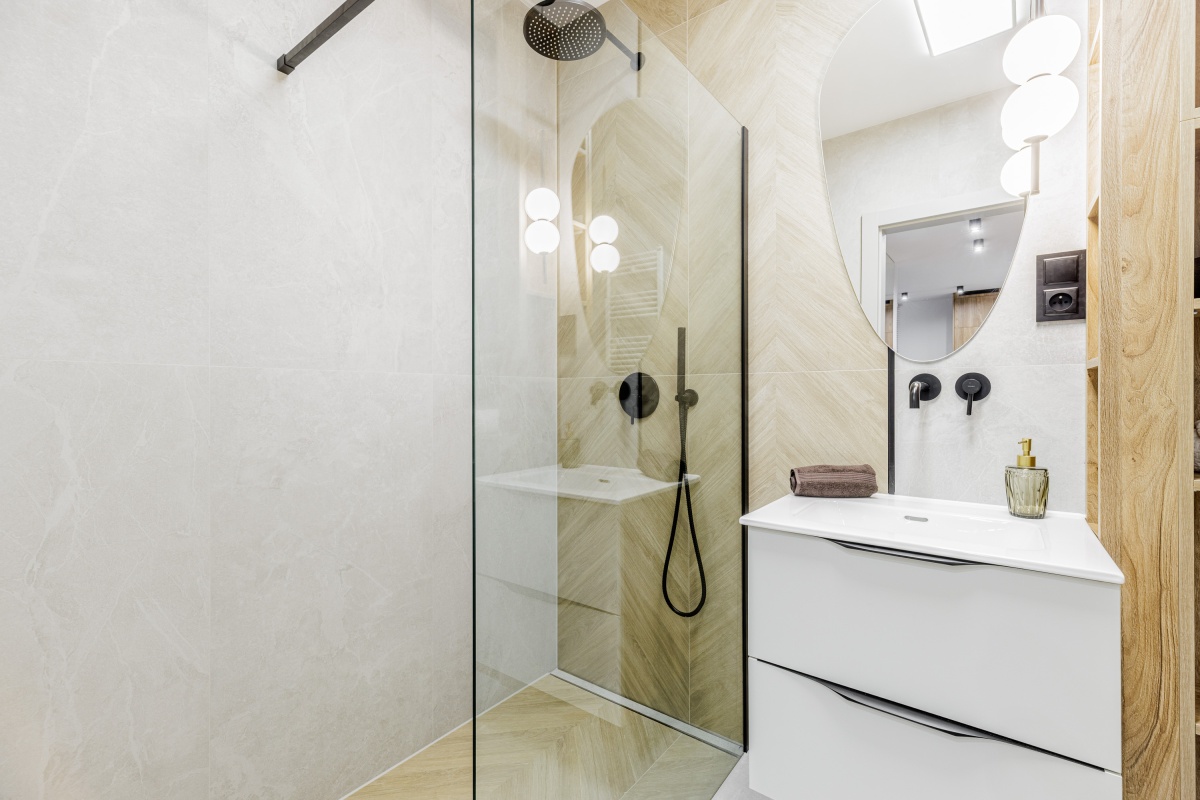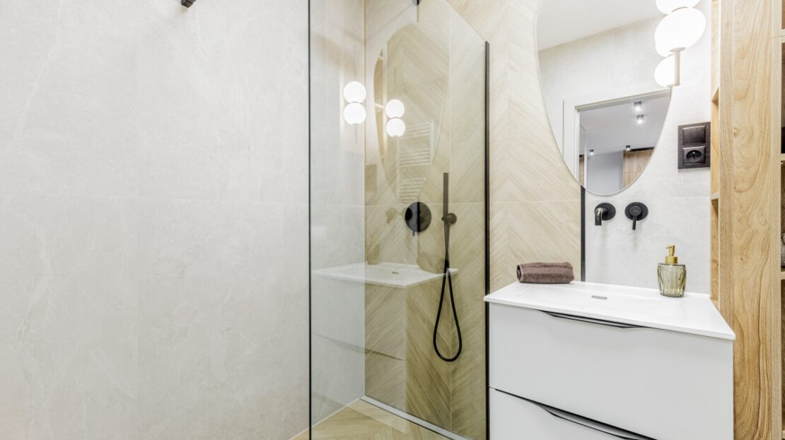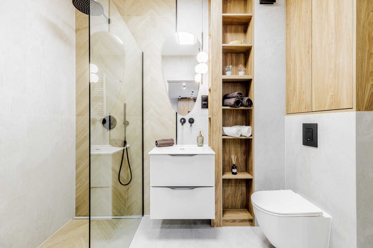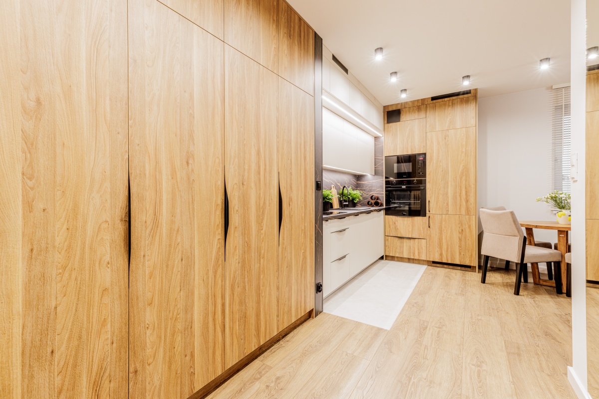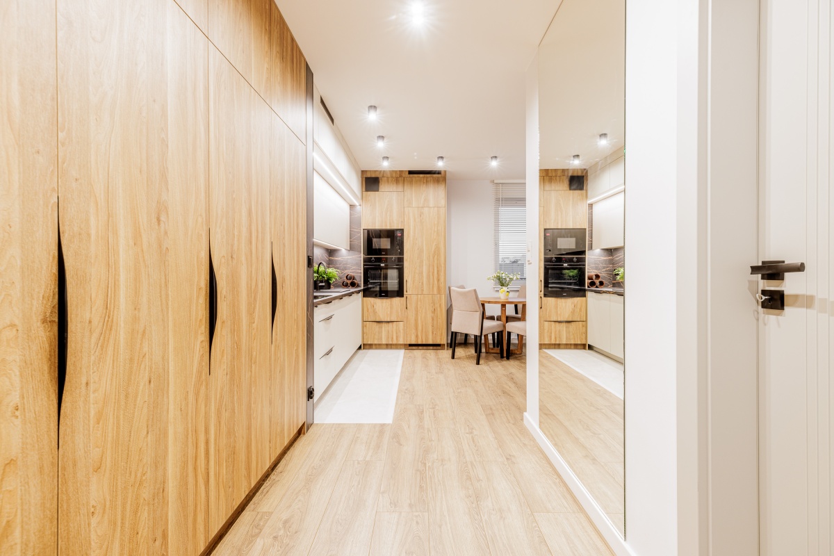 W korytarzu oraz sypialni trzy pojemne szafy na wymiar. W łazience dużo miejsc do przechowywania.