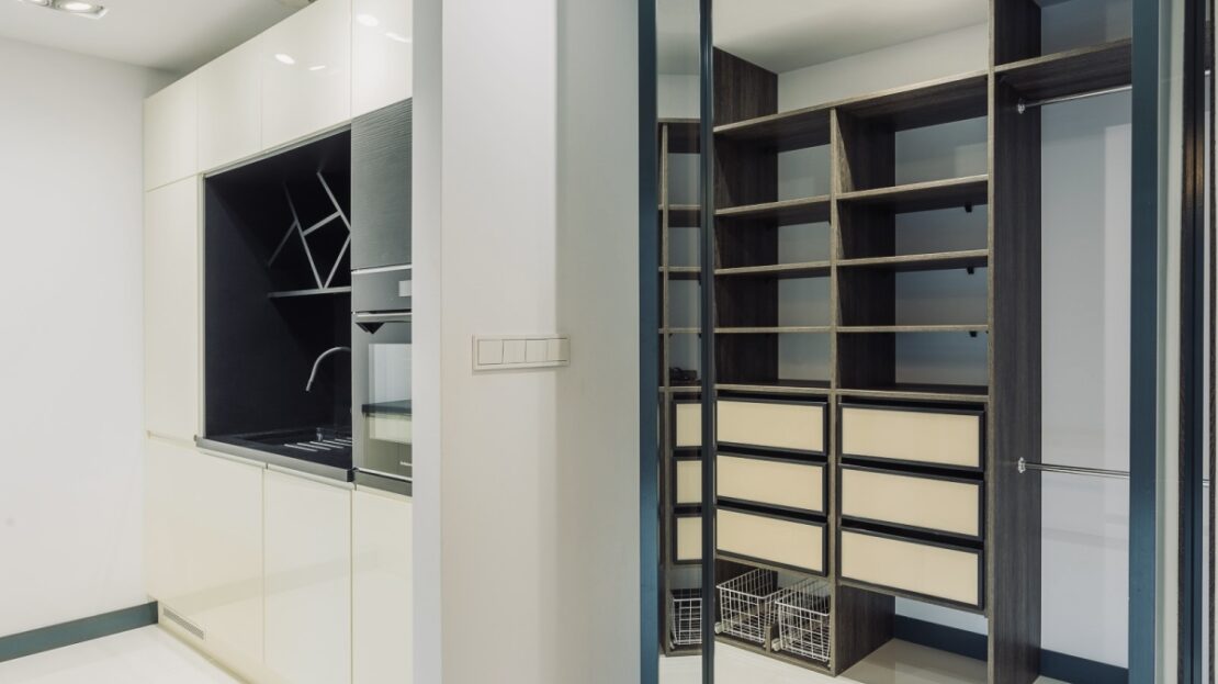 Duża garderoba, zapewniająca mnóstwo miejsca do przechowywania.