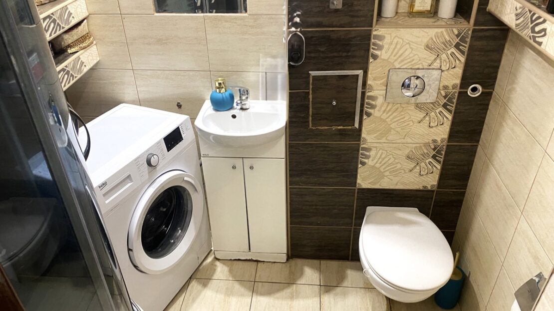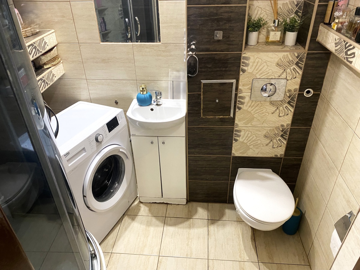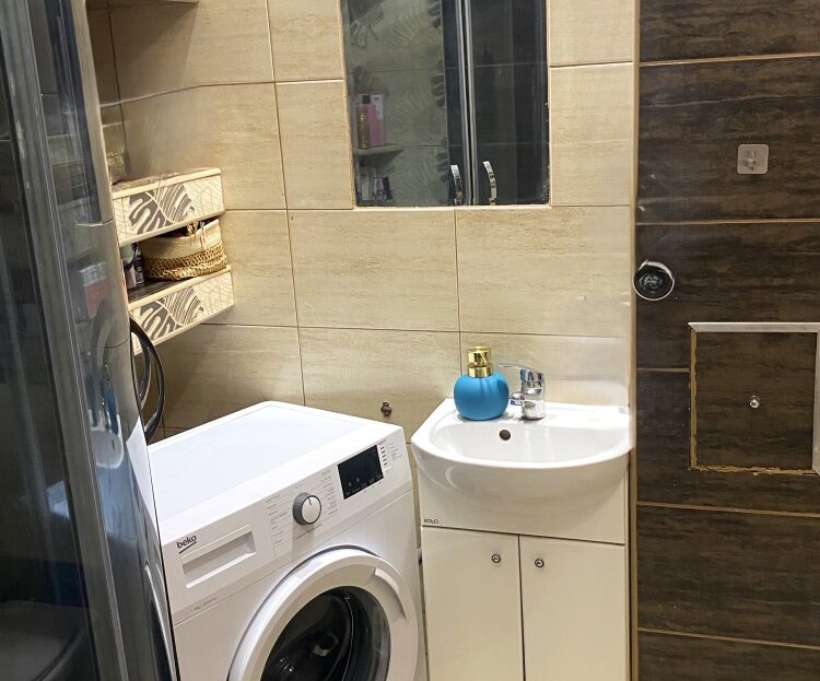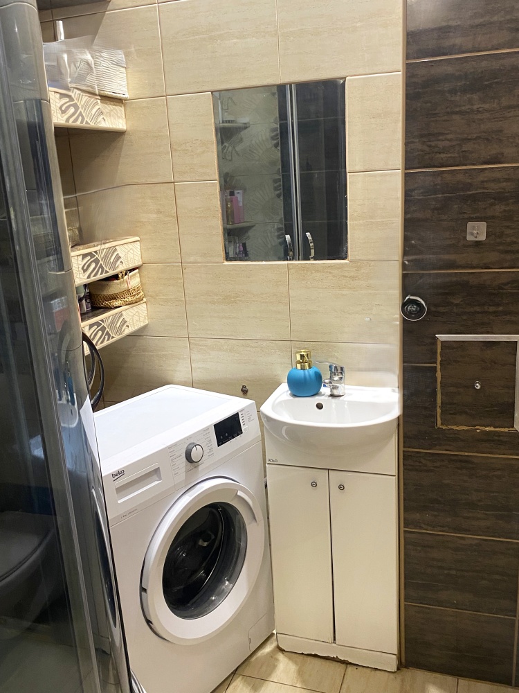 3) Łazienka z WC o powierzchni 2,50 m2 w płytkach . Na wyposażeniu prysznic oraz pralka
