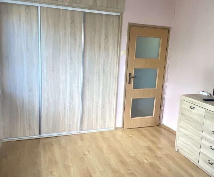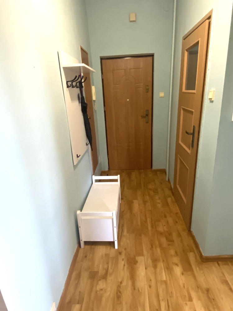 W pokojach na podłodze panele podłogowe, w kuchni i przedpokoju wykładzina PCV.