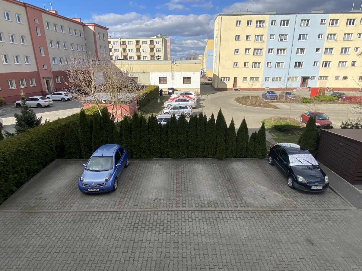 Prywatny parking dla mieszkańców wspólnoty przy budynku, odgrodzony szlabanem na pilota.